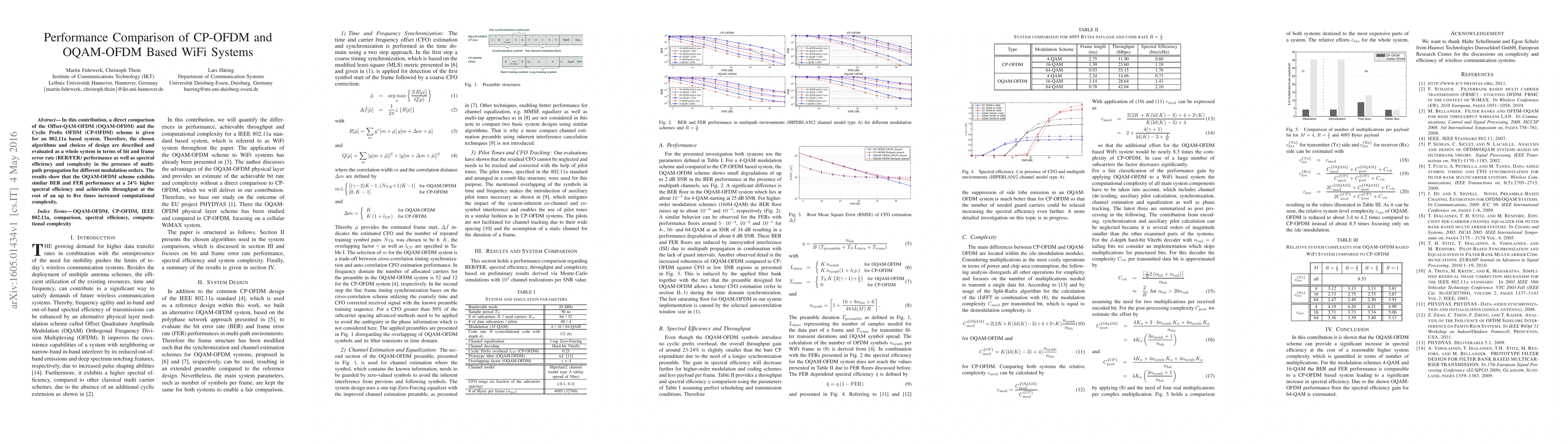 In this contribution, a direct comparison of the Offset-QAM-OFDM (OQAM-OFDM) and the Cyclic Prefix OFDM (CP-OFDM) scheme is given for an 802.11a based system. Therefore, the chosen algorithms and choices of design are described and evaluated as a whole system in terms of bit and frame error rate (BER/FER) performance as well as spectral efficiency and complexity in the presence of multipath propagation for different modulation orders. The results show that the OQAM-OFDM scheme exhibits similar BER and FER performance at a 24% higher spectral efficiency and achievable throughput at the cost of an up to five times increased computational complexity.
