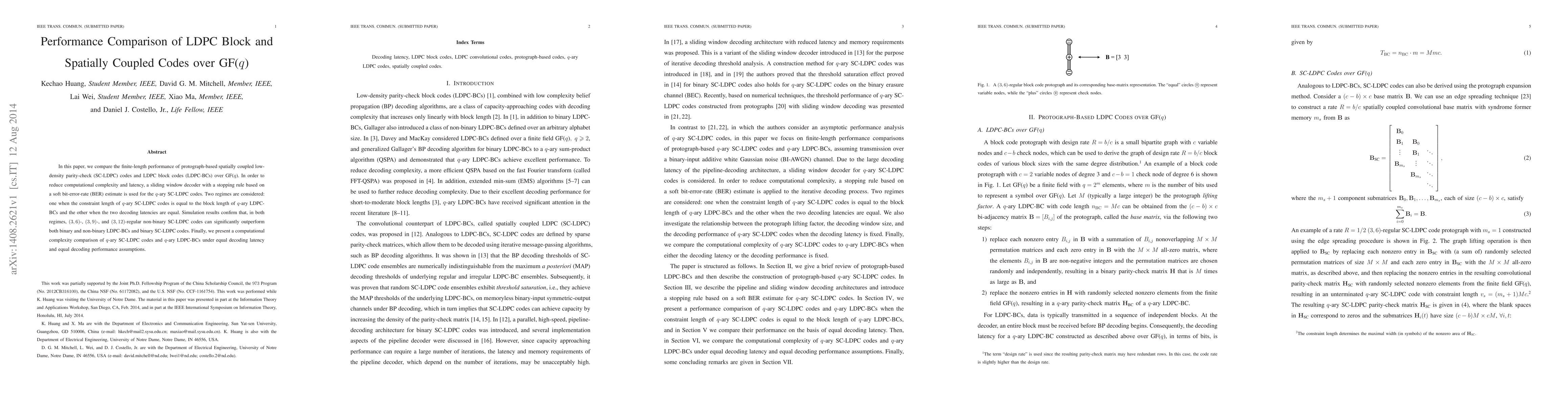 This paper compares the performance of protograph-based spatially coupled low-density parity-check codes (SC-LDPC) against LDPC block codes (LDPC-BCs) over GF(q), finding that non-binary SC-LDPC codes outperform both binary and non-binary LDPC-BCs in terms of finite-length performance. A sliding window decoder reduces complexity and latency for SC-LDPC codes.