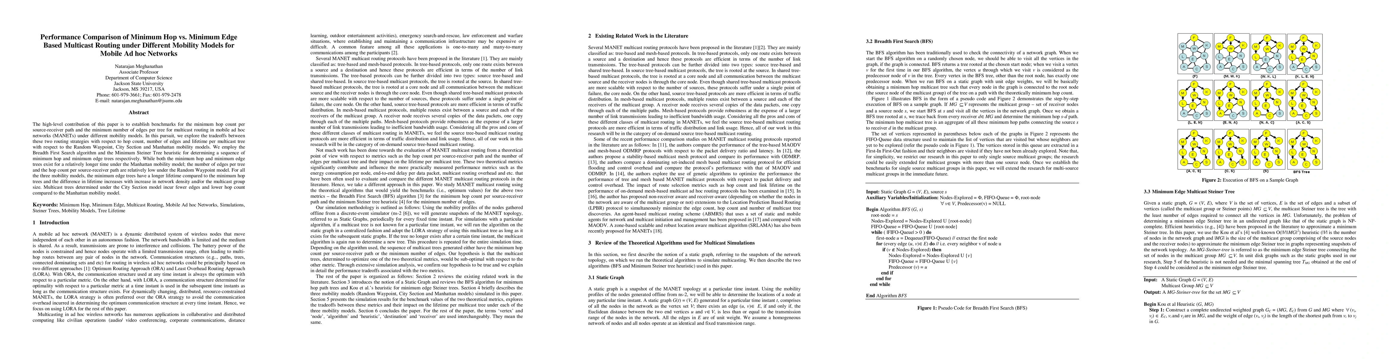 This paper benchmarks minimum hop and minimum edge multicast routing strategies in MANETs under various mobility models, finding that minimum edge trees generally have longer lifetimes, especially with higher network density and larger multicast groups. The Random Waypoint model yields lower hop counts and edge numbers, while the Manhattan model supports longer-lived trees.