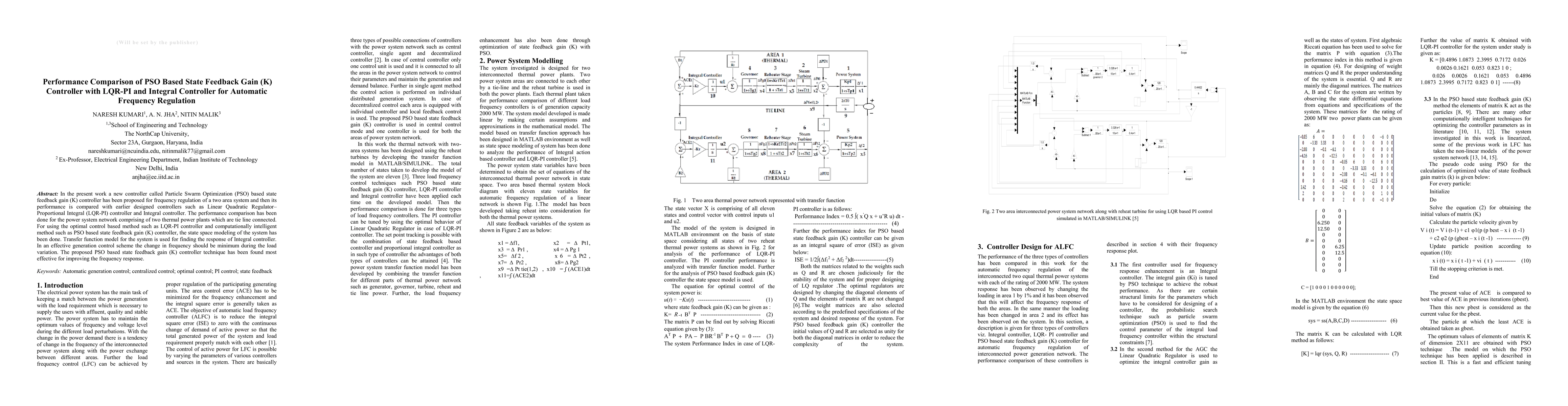 This paper proposes a Particle Swarm Optimization (PSO) based state feedback gain controller for automatic frequency regulation in a two-area power system. It compares the performance of this new controller with Linear Quadratic Regulator Proportional Integral (LQR-PI) and Integral controllers, finding the PSO-based controller to be the most effective in minimizing frequency changes during load variations.