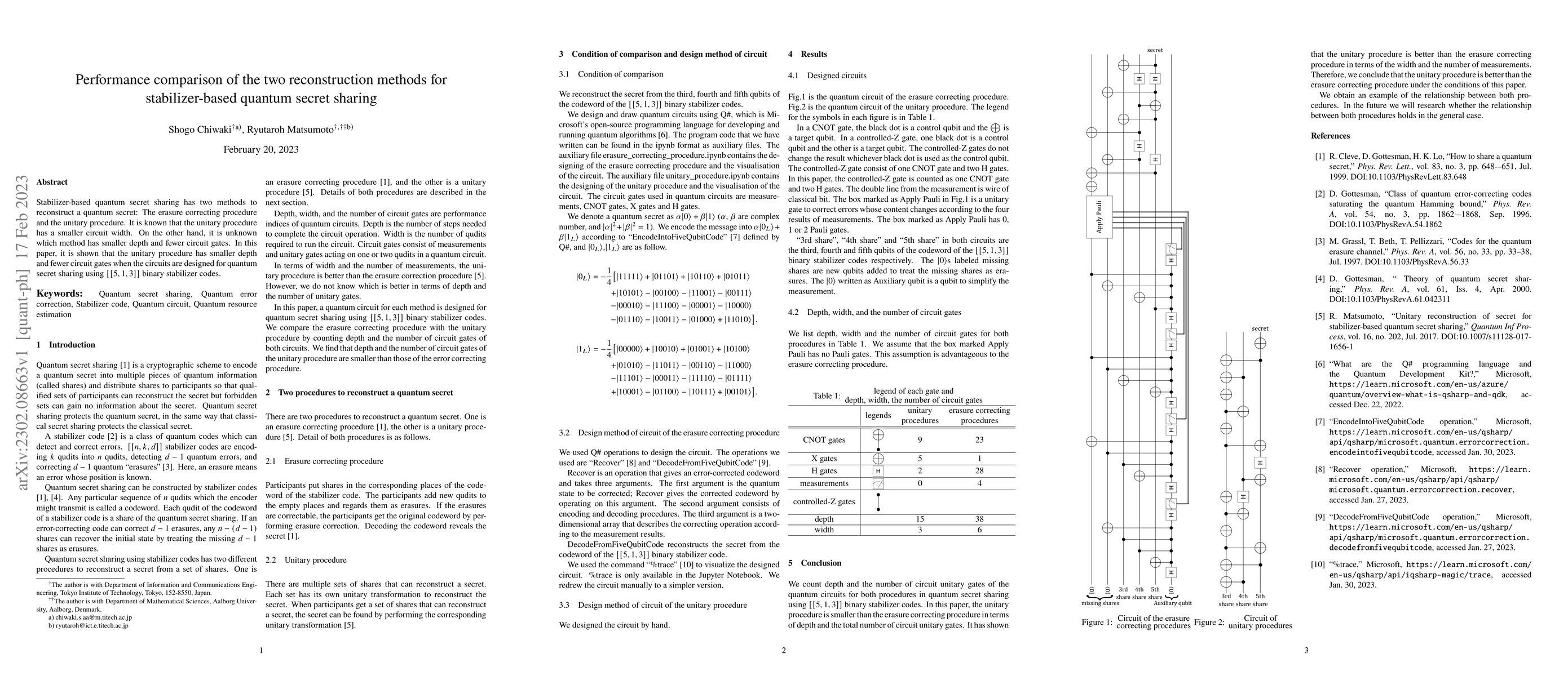 Stabilizer-based quantum secret sharing has two methods to reconstruct a quantum secret: The erasure correcting procedure and the unitary procedure. It is known that the unitary procedure has a smaller circuit width. On the other hand, it is unknown which method has smaller depth and fewer circuit gates. In this paper, it is shown that the unitary procedure has smaller depth and fewer circuit gates when the circuits are designed for quantum secret sharing using $[[5, 1, 3]]$ binary stabilizer codes.