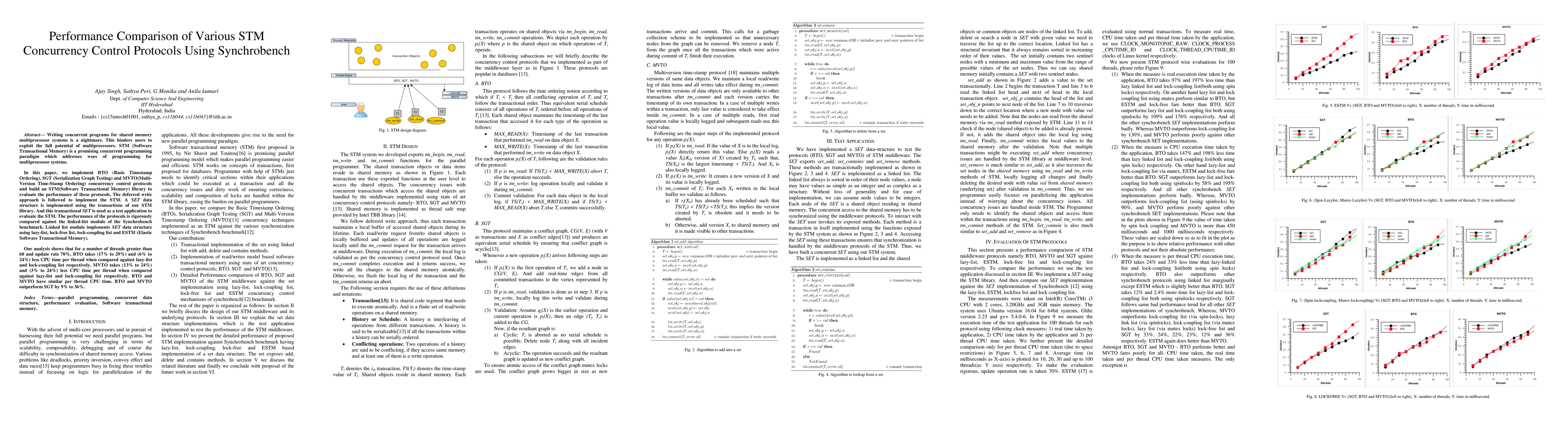 This paper compares the performance of three STM concurrency control protocols (BTO, SGT, MVTO) using Synchrobench benchmark, showing that BTO and MVTO outperform SGT and offer better performance than lazy-list and lock-coupling list for high thread counts and update rates.