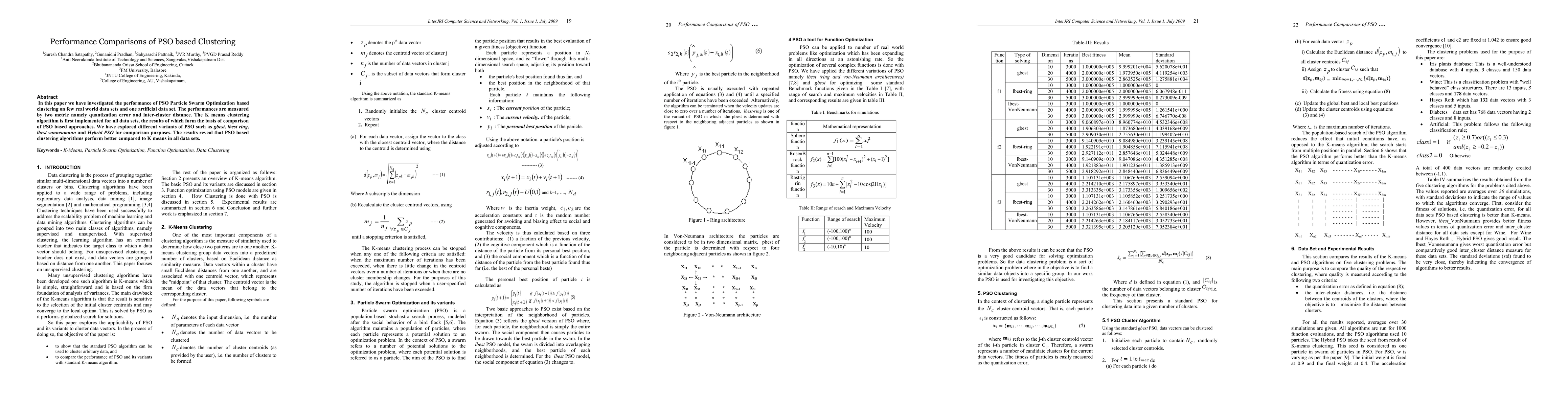 This paper compares the performance of various Particle Swarm Optimization (PSO) based clustering algorithms against K-means on real and artificial datasets, evaluating them using quantization error and inter-cluster distance. Results show that PSO variants generally outperform K-means across all tested datasets.
