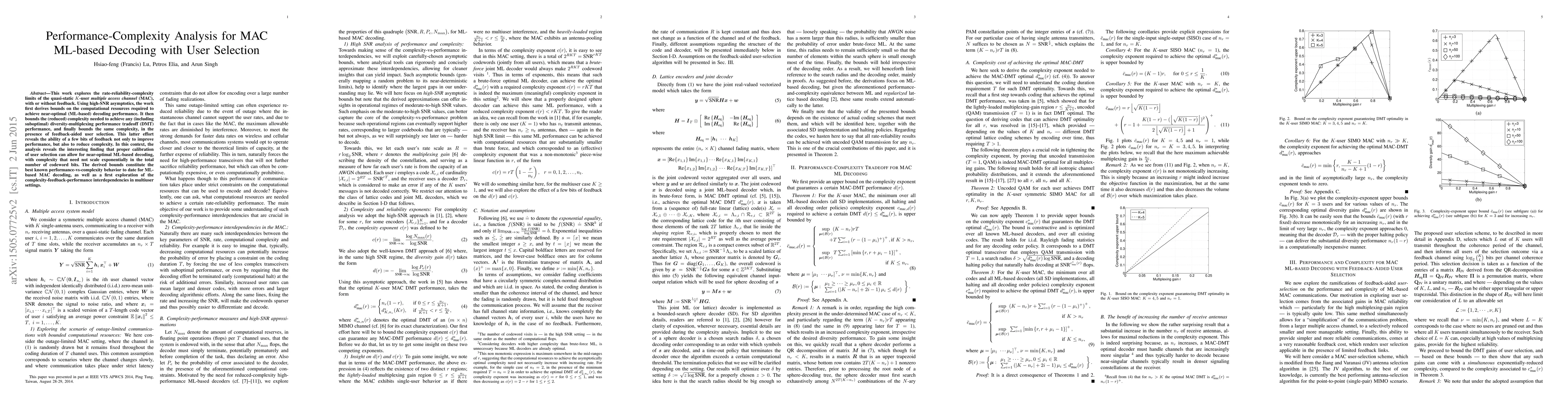 This research analyzes the performance and complexity of maximum likelihood (ML) decoding in quasi-static K-user multiple access channels (MAC), both with and without feedback. It derives bounds on computational resources for near-optimal decoding and complexity for achieving any diversity-multiplexing tradeoff. Interestingly, the study finds that feedback-aided user selection can enhance performance and reduce complexity, potentially avoiding exponential complexity growth with codeword bits.