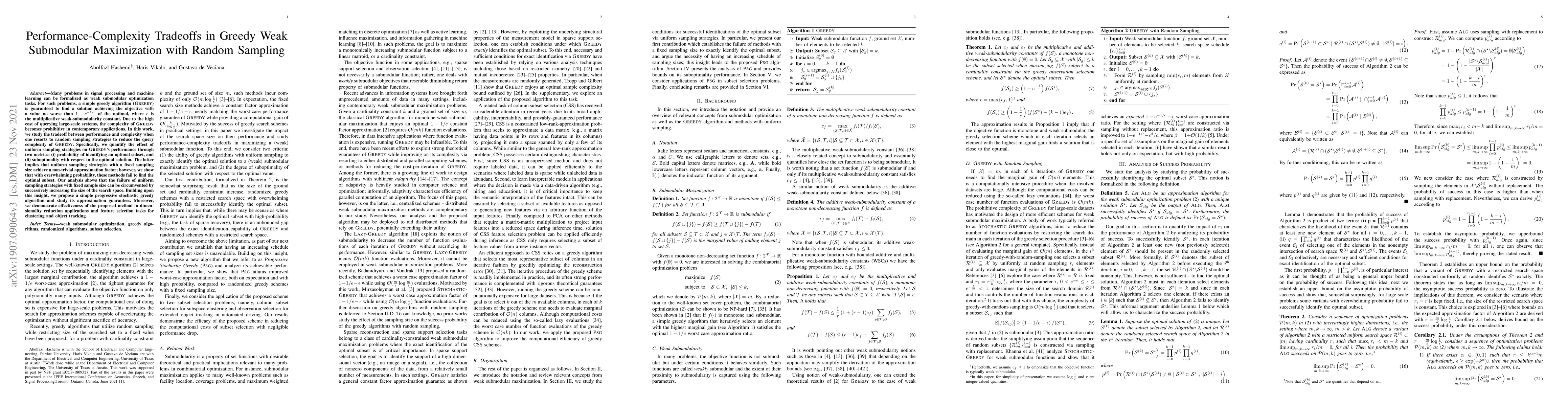 Many problems in signal processing and machine learning can be formalized as weak submodular optimization tasks. For such problems, a simple greedy algorithm (\textsc{Greedy}) is guaranteed to find a solution achieving the objective with a value no worse than $1-e^{-1/c}$ of the optimal, where $c$ is the multiplicative weak-submodularity constant. Due to the high cost of querying large-scale systems, the complexity of \textsc{Greedy} becomes prohibitive in contemporary applications. In this work, we study the tradeoff between performance and complexity when one resorts to random sampling strategies to reduce the query complexity of \textsc{Greedy}. Specifically, we quantify the effect of uniform sampling strategies on \textsc{Greedy}'s performance through two metrics: (i) probability of identifying an optimal subset, and (ii) suboptimality with respect to the optimal solution. The latter implies that uniform sampling strategies with a fixed sampling size achieve a non-trivial approximation factor; however, we show that with overwhelming probability, these methods fail to find the optimal subset. Our analysis shows that the failure of uniform sampling strategies with fixed sample size can be circumvented by successively increasing the size of the search space. Building upon this insight, we propose a simple progressive stochastic greedy algorithm and study its approximation guarantees. Moreover, we demonstrate effectiveness of the proposed method in dimensionality reduction applications and feature selection tasks for clustering and object tracking.