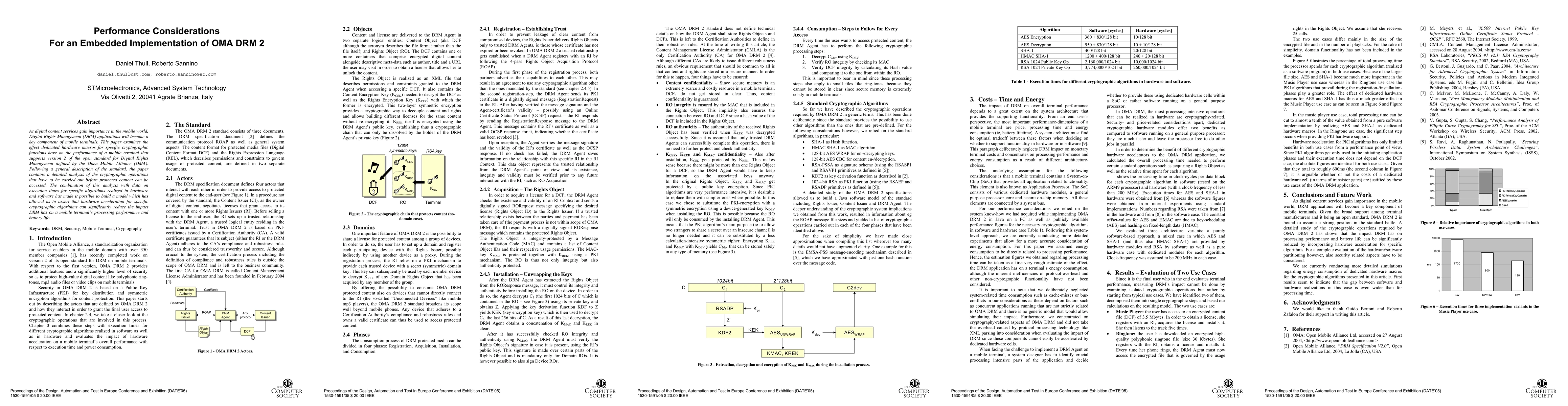 This paper investigates how dedicated hardware macros for specific cryptographic functions enhance performance in embedded implementations of OMA DRM 2, demonstrating that hardware acceleration can significantly reduce the processing load and improve battery life in mobile terminals.