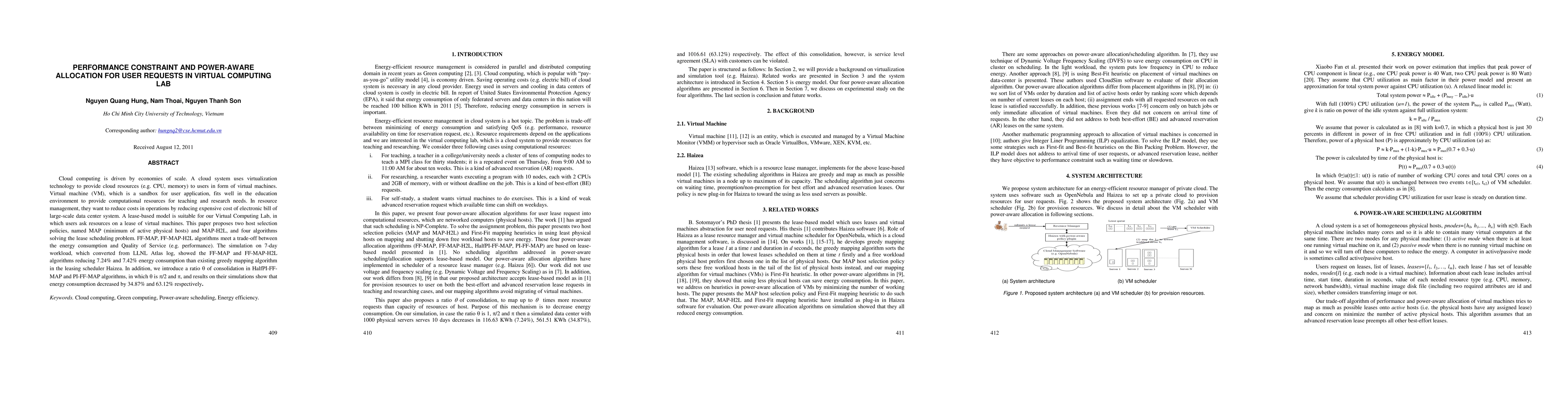 Cloud computing is driven by economies of scale. A cloud system uses virtualization technology to provide cloud resources (e.g. CPU, memory) to users in form of virtual machines. Virtual machine (VM), which is a sandbox for user application, fits well in the education environment to provide computational resources for teaching and research needs. In resource management, they want to reduce costs in operations by reducing expensive cost of electronic bill of large-scale data center system. A lease-based model is suitable for our Virtual Computing Lab, in which users ask resources on a lease of virtual machines. This paper proposes two host selection policies, named MAP (minimum of active physical hosts) and MAP-H2L, and four algorithms solving the lease scheduling problem. FF-MAP, FF-MAP-H2L algorithms meet a trade-off between the energy consumption and Quality of Service (e.g. performance). The simulation on 7-day workload, which converted from LLNL Atlas log, showed the FF-MAP and FF-MAP-H2L algorithms reducing 7.24% and 7.42% energy consumption than existing greedy mapping algorithm in the leasing scheduler Haizea. In addition, we introduce a ratio \theta of consolidation in HalfPI-FF-MAP and PI-FF-MAP algorithms, in which \theta is \pi/2 and \pi, and results on their simulations show that energy consumption decreased by 34.87% and 63.12% respectively.