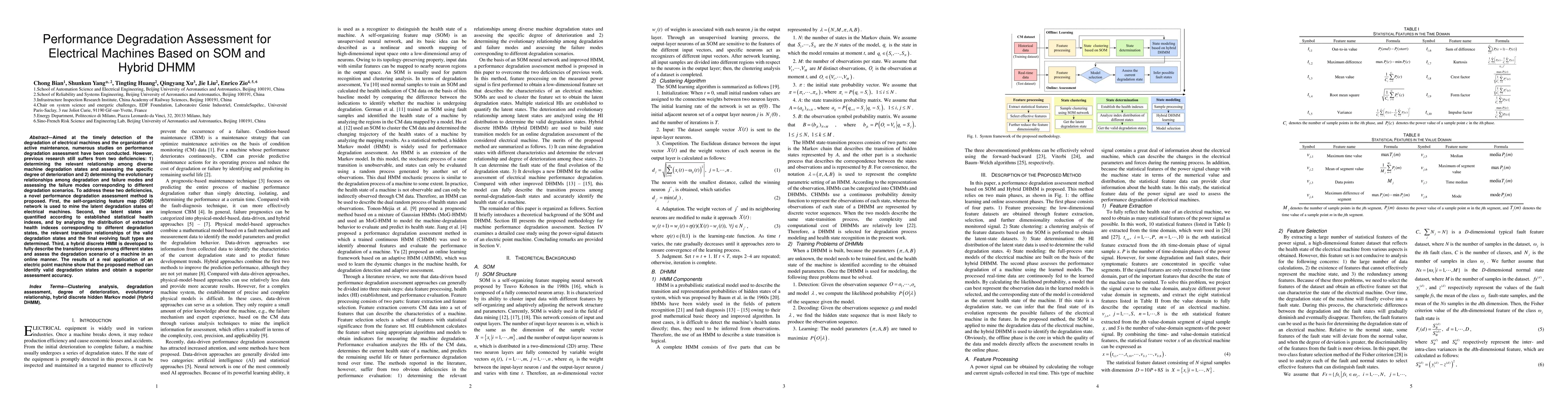 This paper proposes a novel method using SOM and hybrid DHMM for timely detection and assessment of electrical machine degradation, addressing deficiencies in determining degradation states and failure modes. The method identifies latent degradation states, quantifies them using statistical health indexes, and assesses transitions to failure modes, demonstrating superior accuracy in real-world applications.