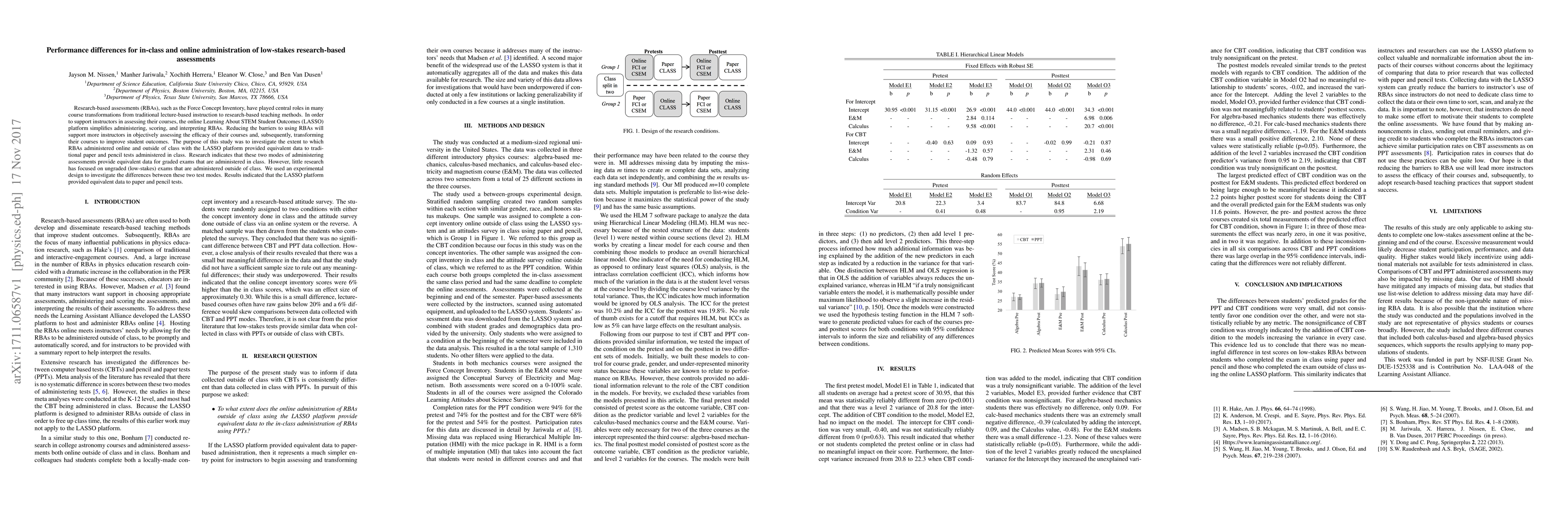 This study investigates whether low-stakes research-based assessments administered online via the LASSO platform yield equivalent results compared to traditional in-class paper and pencil tests. Findings suggest that both modes provide equivalent data, supporting the use of online assessments for course evaluation.