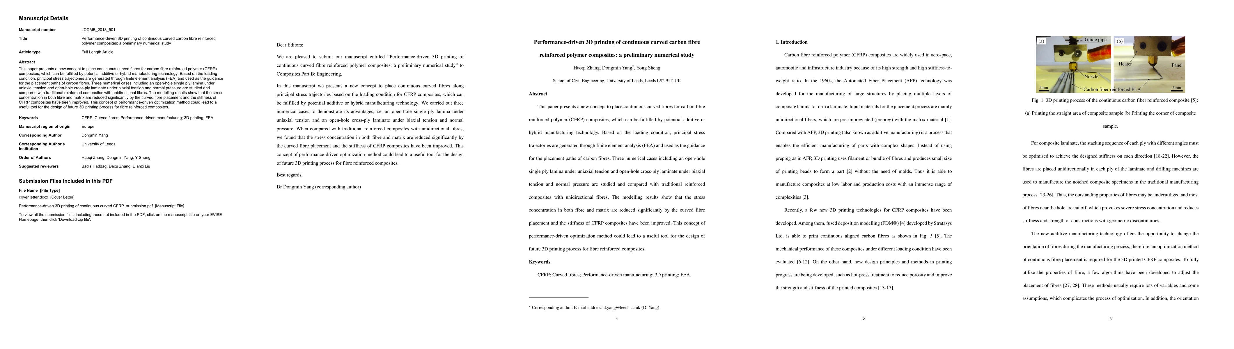 This paper introduces a new method for placing continuous curved fibres in CFRP composites using performance-driven optimization, guided by finite element analysis. The study shows that curved fibre placement reduces stress concentration and improves stiffness compared to traditional unidirectional fibre composites, suggesting potential for advanced 3D printing techniques.
