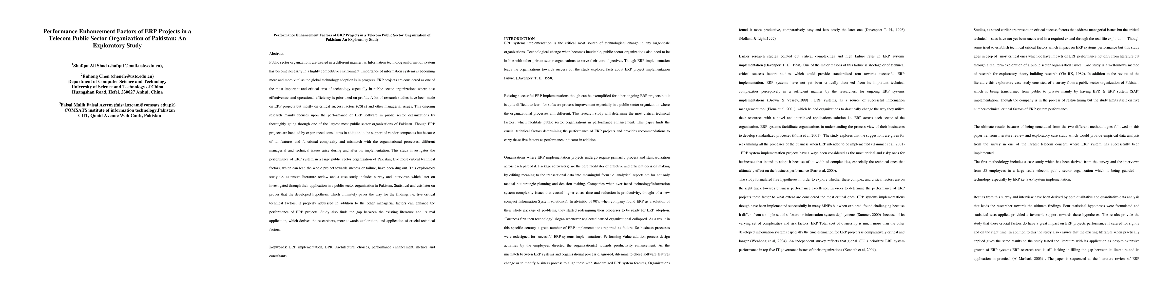 This study explores the performance enhancement factors of ERP projects in a major public sector telecom organization in Pakistan, focusing on five critical technical factors that determine project success or failure. Through an extensive literature review and case study involving surveys and interviews, the research identifies key technical aspects influencing ERP project outcomes in public sector settings.