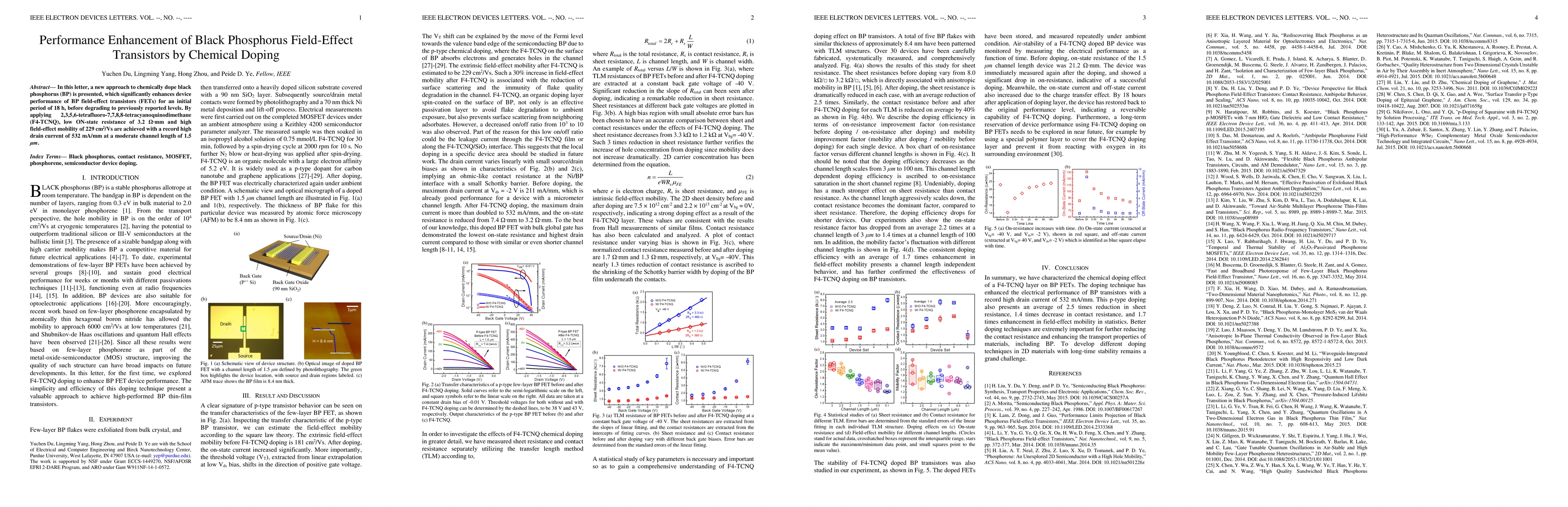 This paper presents a new chemical doping method using F4-TCNQ to enhance the performance of black phosphorus field-effect transistors, achieving a low ON-state resistance and high field-effect mobility for 18 hours. The method results in a record high drain current of 532 mA/mm.