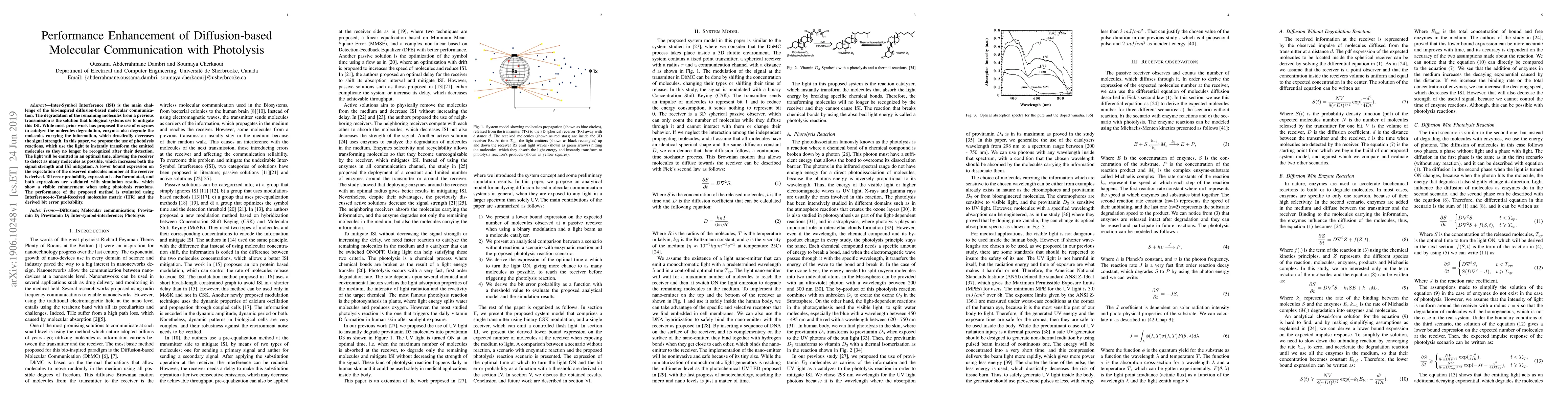 This paper proposes using photolysis reactions to enhance diffusion-based molecular communication by mitigating Inter-Symbol Interference (ISI) without degrading signal strength. Simulation results show improved performance using the proposed method, validated by derived expressions for expected observed molecules and bit error probability.