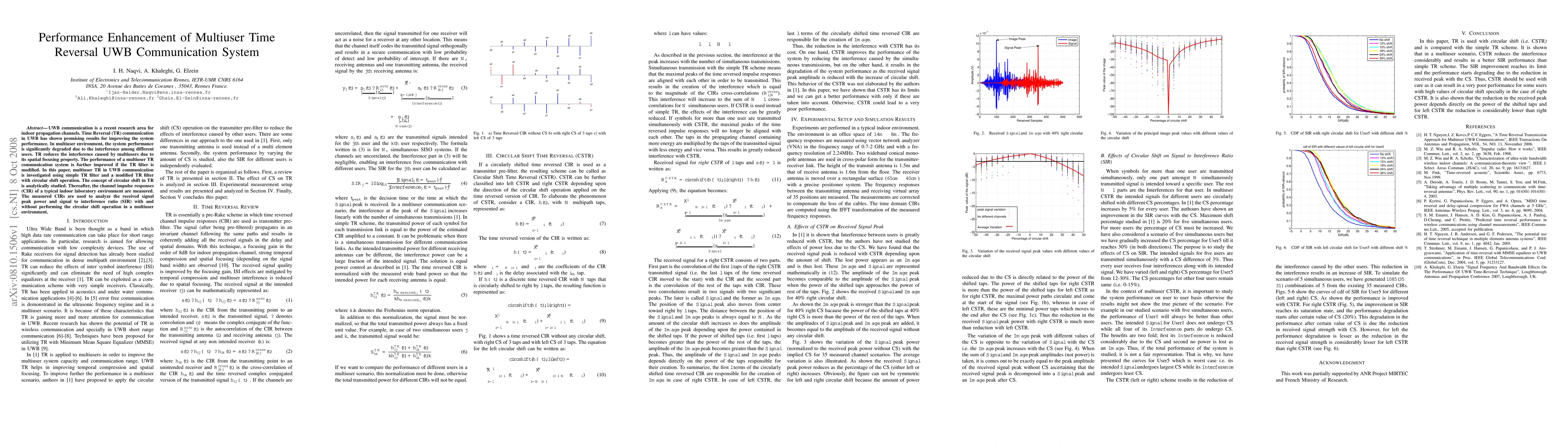 This paper investigates the performance enhancement of multiuser Time Reversal (TR) Ultra-Wideband (UWB) communication systems using both a simple TR filter and a modified TR filter with circular shift operation. The study measures channel impulse responses to analyze received signal peak power and signal-to-interference ratio, demonstrating improved performance with the circular shift modification.