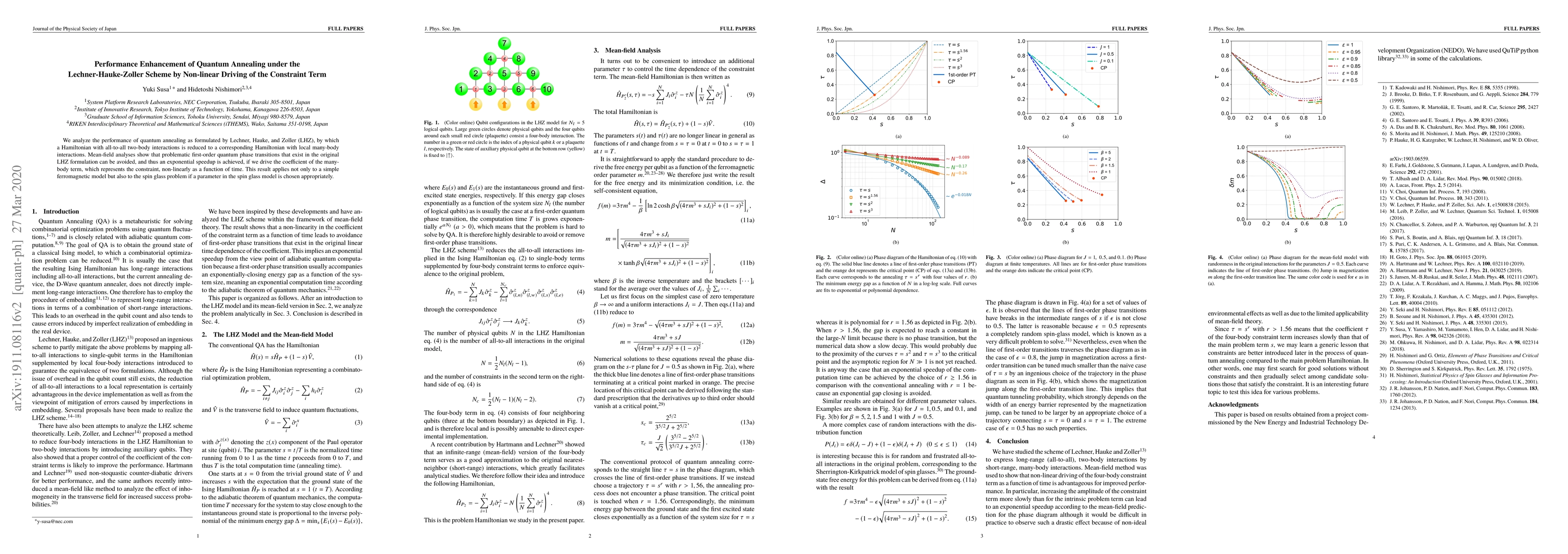 We analyze the performance of quantum annealing as formulated by Lechner, Hauke, and Zoller (LHZ), by which a Hamiltonian with all-to-all two-body interactions is reduced to a corresponding Hamiltonian with local many-body interactions. Mean-field analyses show that problematic first-order quantum phase transitions that exist in the original LHZ formulation can be avoided, and thus an exponential speedup is achieved, if we drive the coefficient of the many-body term, which represents the constraint, non-linearly as a function of time. This result applies not only to a simple ferromagnetic model but also to the spin glass problem if a parameter in the spin glass model is chosen appropriately.
