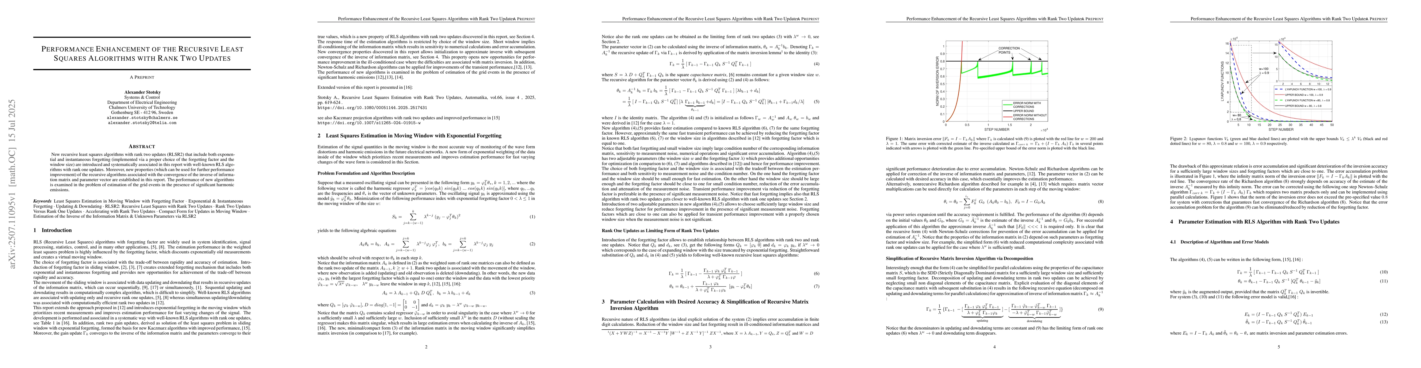 New recursive least squares algorithms with rank two updates (RLSR2) that include both exponential and instantaneous forgetting (implemented via a proper choice of the forgetting factor and the window size) are introduced and systematically associated in this report with well-known RLS algorithms with rank one updates. Moreover, new properties (which can be used for further performance improvement) of the recursive algorithms associated with the convergence of the inverse of information matrix and parameter vector are established in this report. The performance of new algorithms is examined in the problem of estimation of the grid events in the presence of significant harmonic emissions.