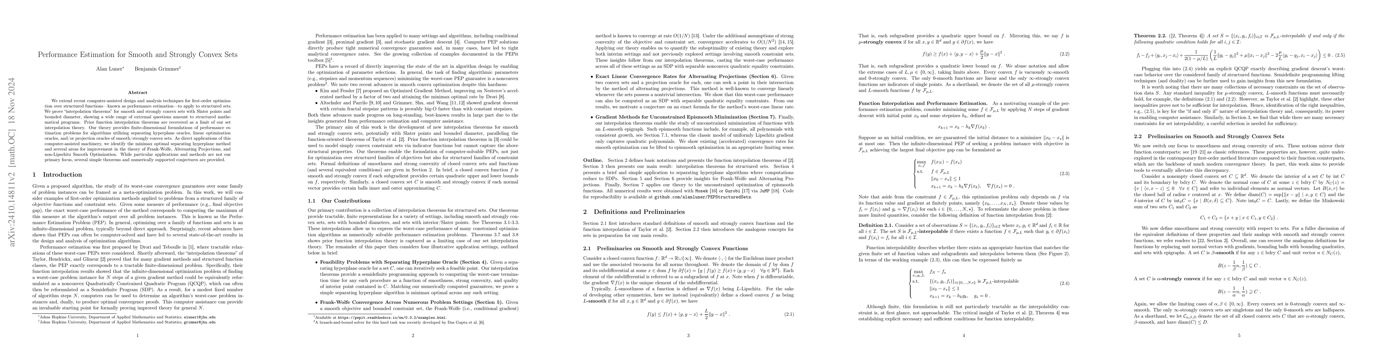 We extend recent computer-assisted design and analysis techniques for first-order optimization over structured functions--known as performance estimation--to apply to structured sets. We prove "interpolation theorems" for smooth and strongly convex sets with Slater points and bounded diameter, showing a wide range of extremal questions amount to structured mathematical programs. Prior function interpolation theorems are recovered as a limit of our set interpolation theory. Our theory provides finite-dimensional formulations of performance estimation problems for algorithms utilizing separating hyperplane oracles, linear optimization oracles, and/or projection oracles of smooth/strongly convex sets. As direct applications of this computer-assisted machinery, we identify the minimax optimal separating hyperplane method and several areas for improvement in the theory of Frank-Wolfe, Alternating Projections, and non-Lipschitz Smooth Optimization. While particular applications and methods are not our primary focus, several simple theorems and numerically supported conjectures are provided.