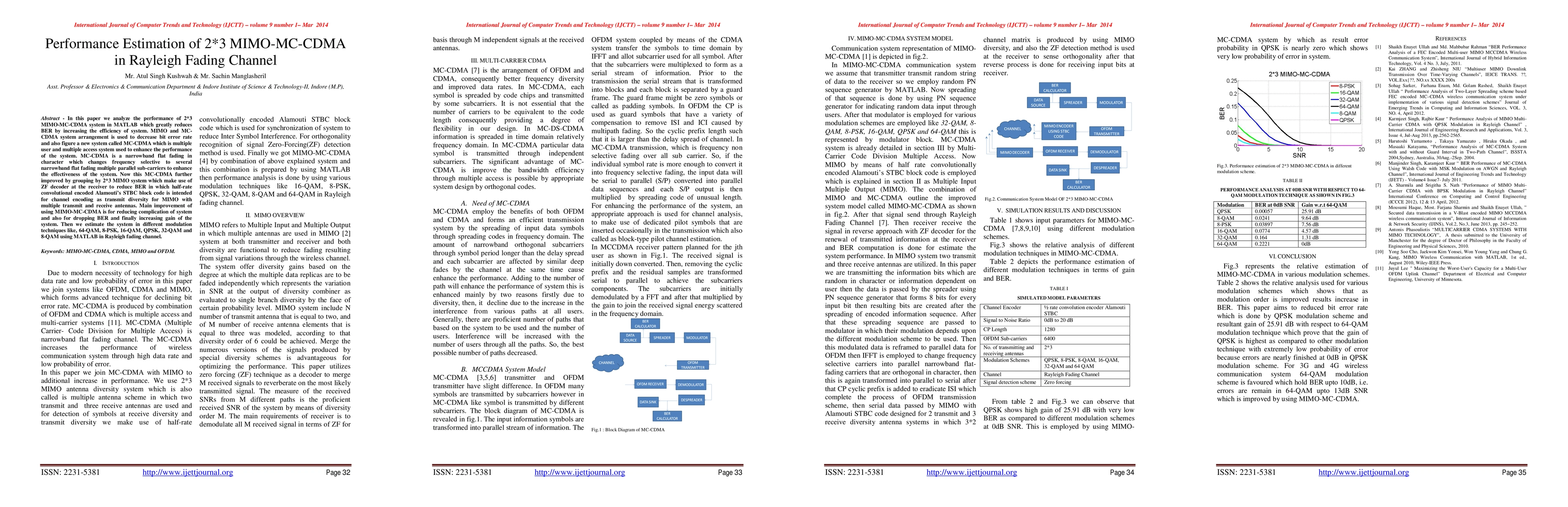 This paper evaluates the performance of a 2x3 MIMO-MC-CDMA system in MATLAB, demonstrating significant reduction in bit error rate (BER) through enhanced system efficiency. The study employs a ZF decoder and Alamouti STBC for channel encoding, estimating performance across various modulation techniques in a Rayleigh fading channel.