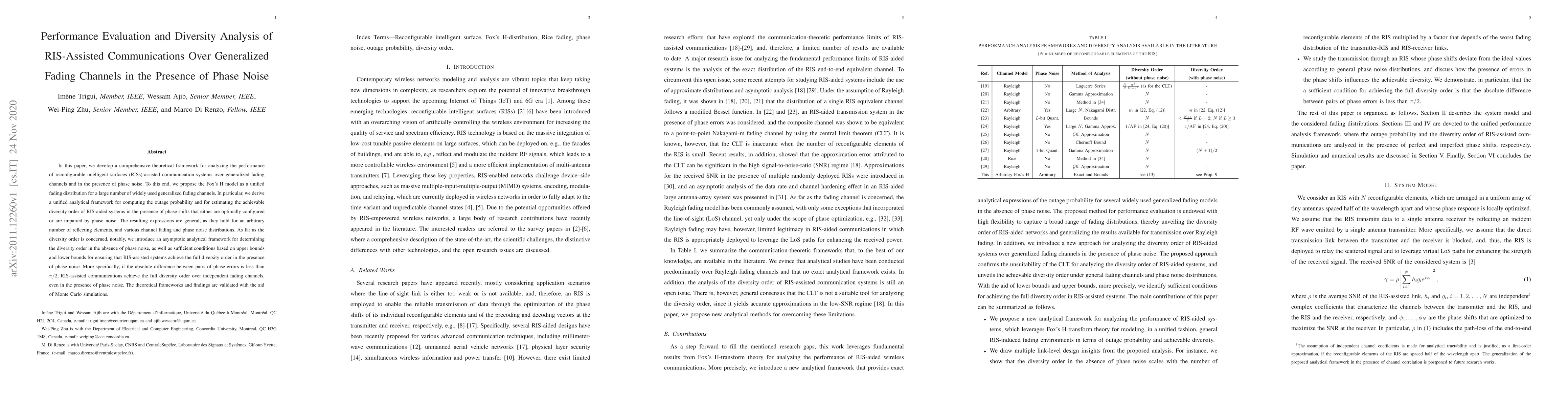 This paper develops a theoretical framework for evaluating the performance of RIS-assisted communication systems over generalized fading channels, considering phase noise. It introduces Fox's H model for unified fading analysis and provides analytical expressions for outage probability and diversity order, validated by Monte Carlo simulations.