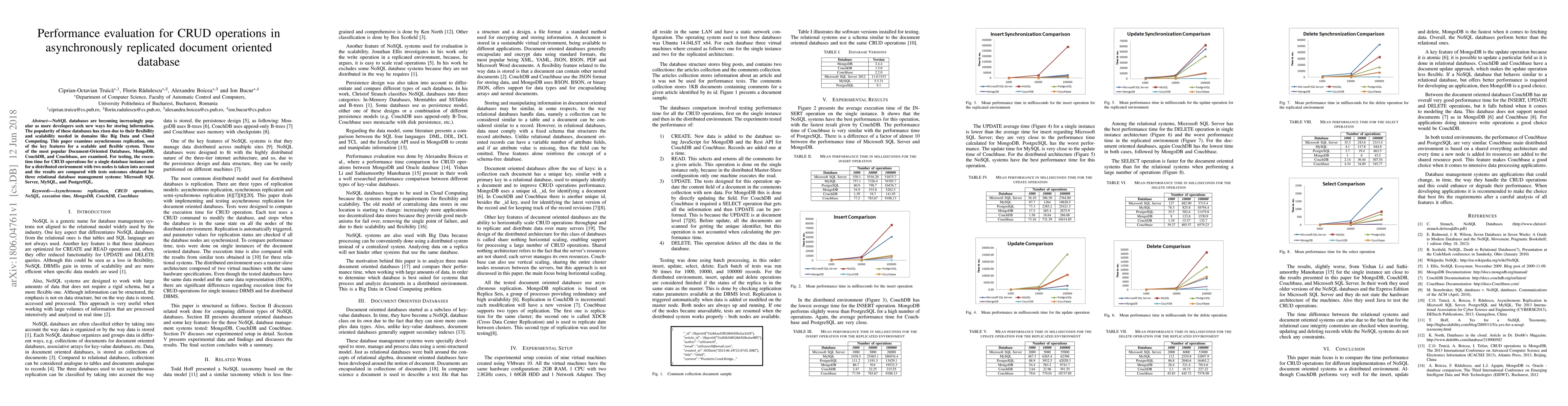 NoSQL databases are becoming increasingly popular as more developers seek new ways for storing information. The popularity of these databases has risen due to their flexibility and scalability needed in domains like Big Data and Cloud Computing. This paper examines asynchronous replication, one of the key features for a scalable and flexible system. Three of the most popular Document-Oriented Databases, MongoDB, CouchDB, and Couchbase, are examined. For testing, the execution time for CRUD operations for a single database instance and for a distributed environment with two nodes is taken into account and the results are compared with tests outcomes obtained for three relational database management systems: Microsoft SQL Server, MySQL, and PostgreSQL.