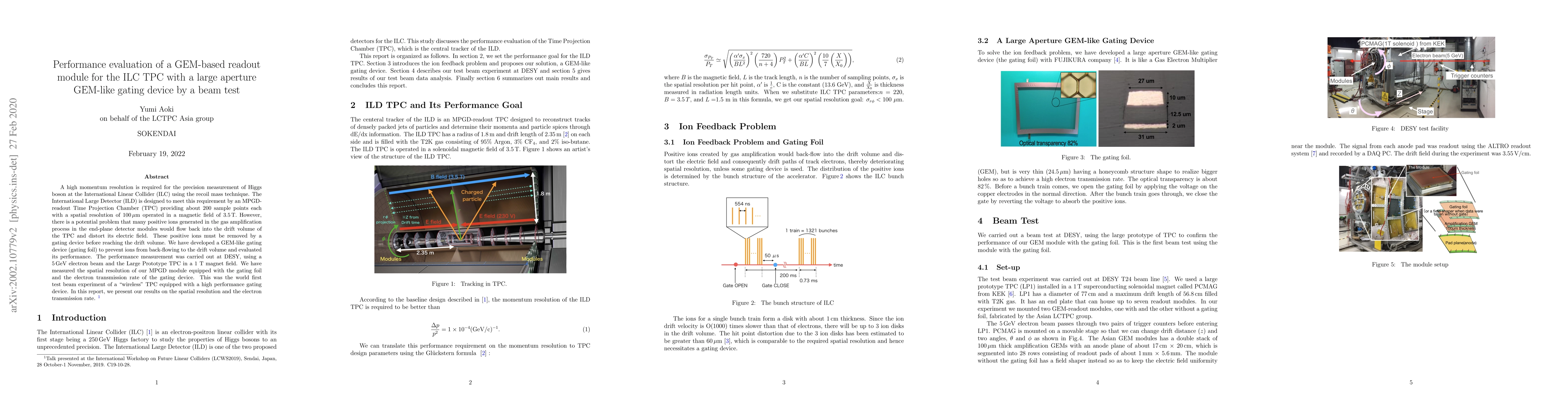 This paper evaluates the performance of a GEM-based readout module with a GEM-like gating device for the ILD TPC at the ILC, focusing on spatial resolution and electron transmission rate. The test, conducted at DESY, demonstrated the effectiveness of the gating foil in preventing ion back-flow and maintaining precision measurements.