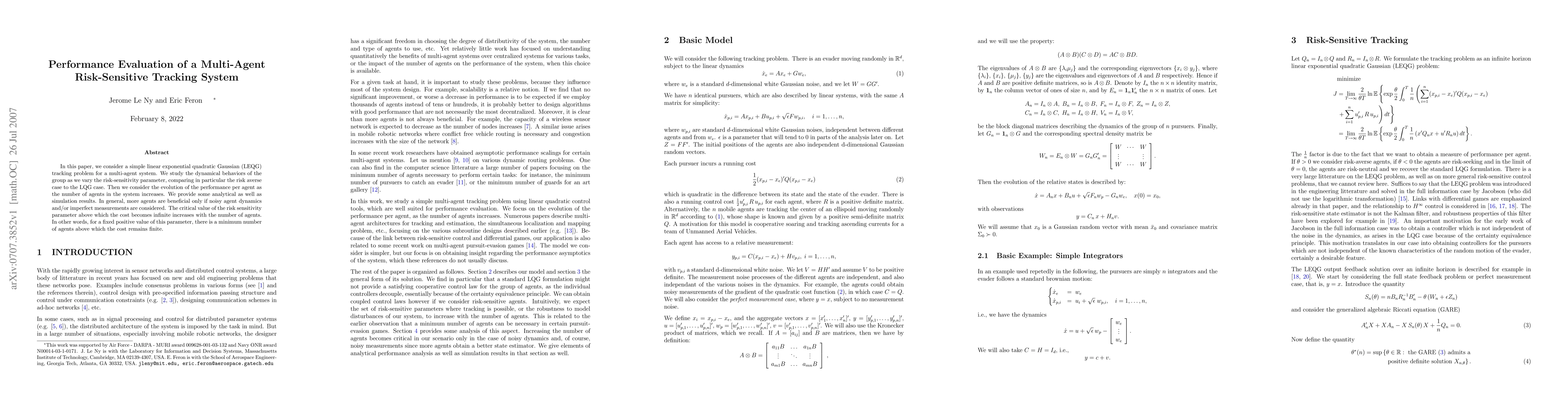 In this paper, we consider a simple linear exponential quadratic Gaussian (LEQG) tracking problem for a multi-agent system. We study the dynamical behaviors of the group as we vary the risk-sensitivity parameter, comparing in particular the risk averse case to the LQG case. Then we consider the evolution of the performance per agent as the number of agents in the system increases. We provide some analytical as well as simulation results. In general, more agents are beneficial only if noisy agent dynamics and/or imperfect measurements are considered. The critical value of the risk sensitivity parameter above which the cost becomes infinite increases with the number of agents. In other words, for a fixed positive value of this parameter, there is a minimum number of agents above which the cost remains finite.