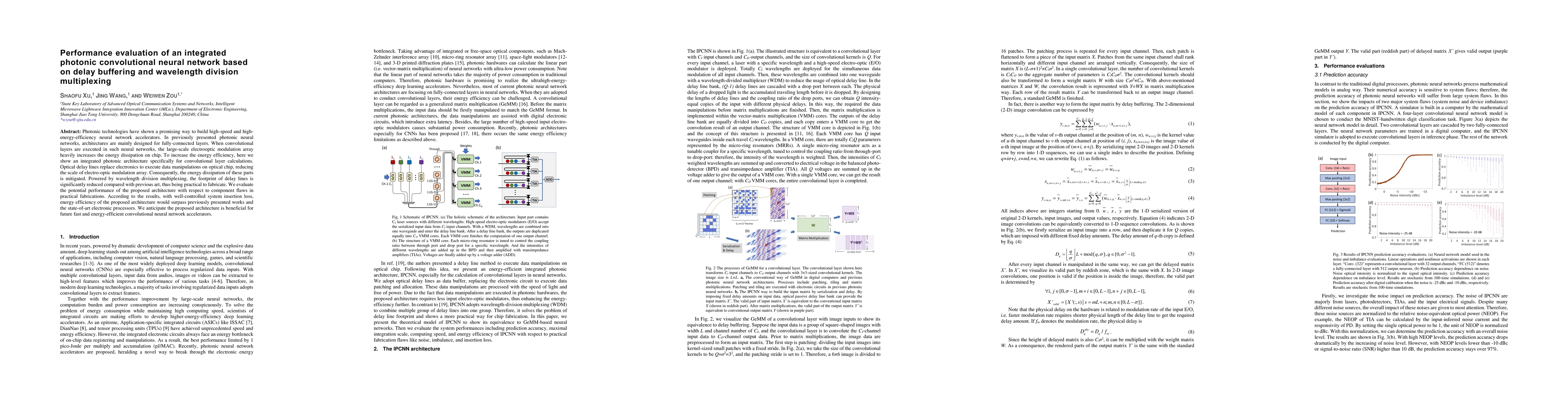 This paper proposes an integrated photonic architecture for convolutional neural networks that utilizes optical delay lines and wavelength division multiplexing to reduce energy dissipation and chip footprint, achieving higher energy efficiency compared to previous designs and electronic processors. The evaluation shows potential performance improvements, making it a promising approach for future fast and efficient neural network accelerators.