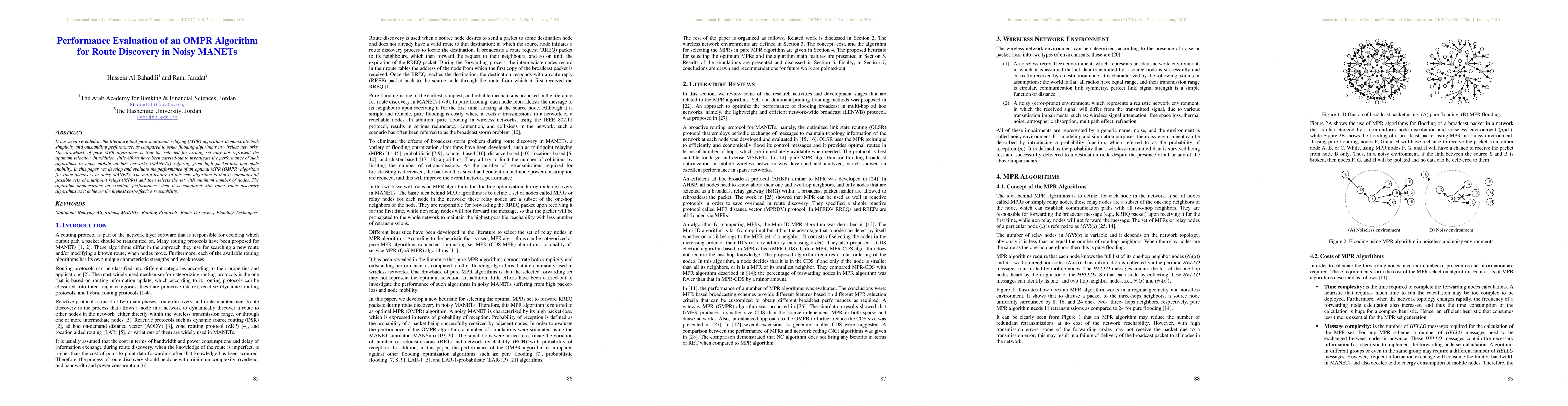 This paper develops and evaluates an optimal multipoint relaying (OMPR) algorithm for route discovery in noisy mobile ad hoc networks (MANETs). The OMPR algorithm calculates all possible sets of multipoint relays and selects the optimal set with the minimum number of nodes, achieving superior cost-effective reachability compared to other route discovery algorithms.