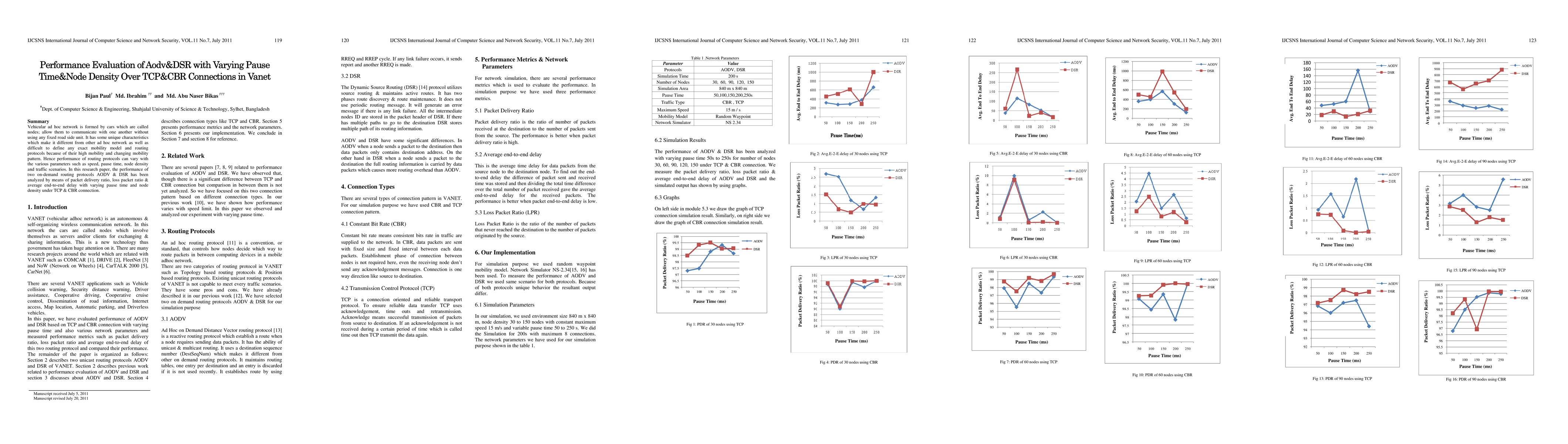 This paper evaluates the performance of AODV and DSR routing protocols in vehicular ad hoc networks under varying pause time and node density, using TCP and CBR traffic scenarios. Key metrics include packet delivery ratio, packet loss ratio, and average end-to-end delay.