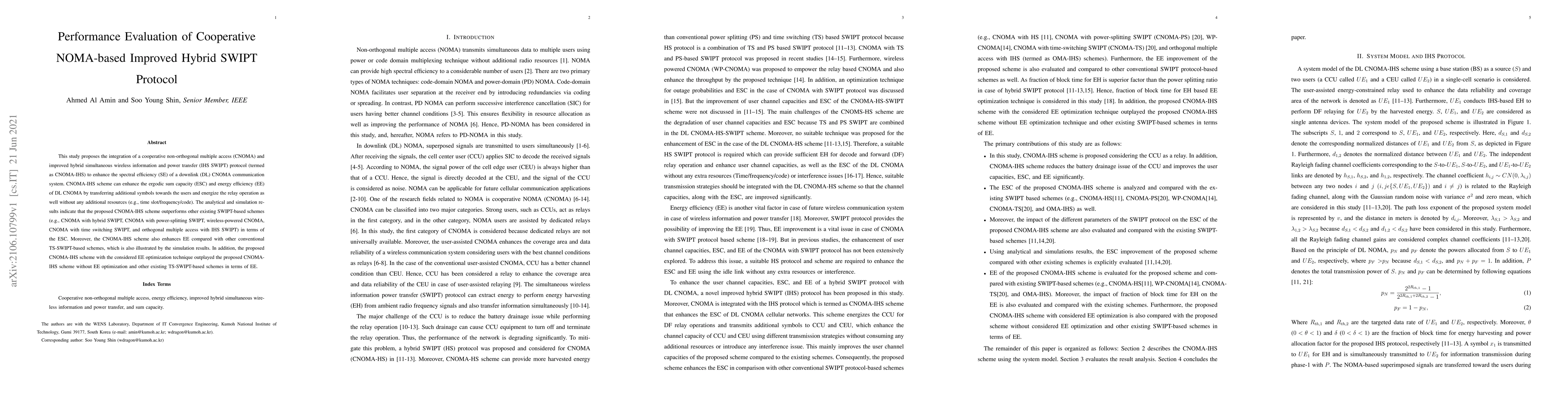 This paper proposes a cooperative non-orthogonal multiple access (CNOMA) integrated with an improved hybrid simultaneous wireless information and power transfer (IHS SWIPT) protocol (CNOMA-IHS) to boost spectral efficiency in a downlink CNOMA system. The CNOMA-IHS scheme enhances ergodic sum capacity and energy efficiency without additional resources, outperforming existing SWIPT-based schemes in terms of both metrics.