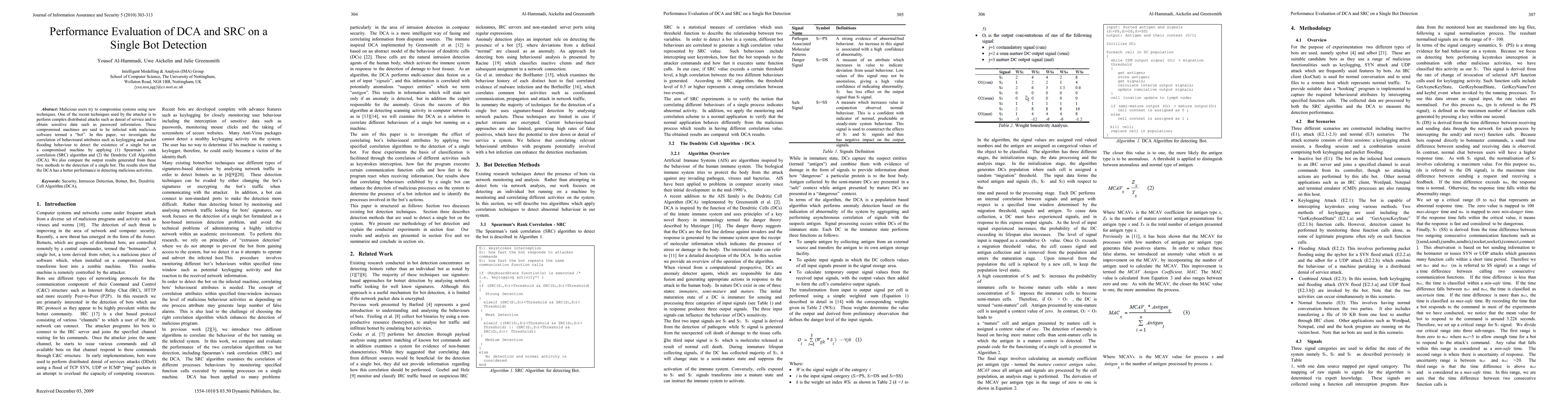This paper evaluates the effectiveness of the Dendritic Cell Algorithm (DCA) and Spearman's rank correlation (SRC) in detecting a single bot on a compromised machine. The study finds that the DCA outperforms SRC in detecting malicious activities based on behavioral attributes like keylogging and packet flooding.