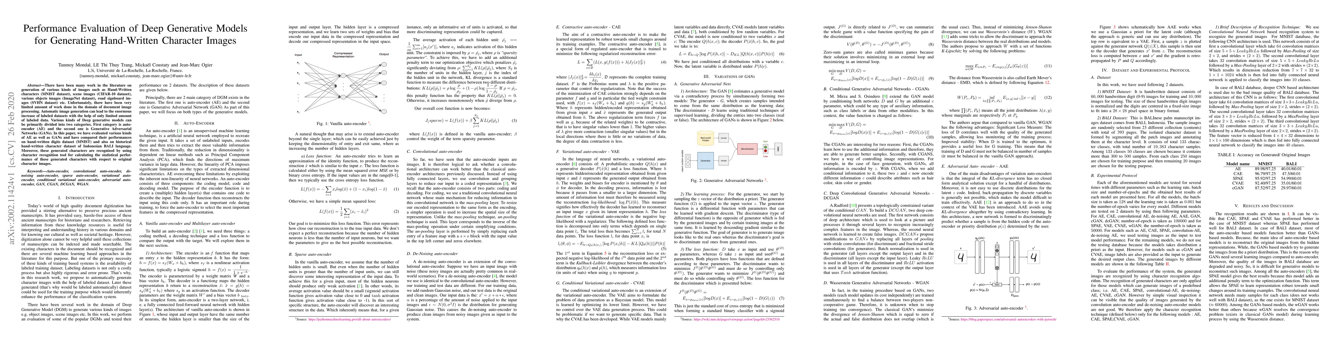 There have been many work in the literature on generation of various kinds of images such as Hand-Written characters (MNIST dataset), scene images (CIFAR-10 dataset), various objects images (ImageNet dataset), road signboard images (SVHN dataset) etc. Unfortunately, there have been very limited amount of work done in the domain of document image processing. Automatic image generation can lead to the enormous increase of labeled datasets with the help of only limited amount of labeled data. Various kinds of Deep generative models can be primarily divided into two categories. First category is auto-encoder (AE) and the second one is Generative Adversarial Networks (GANs). In this paper, we have evaluated various kinds of AE as well as GANs and have compared their performances on hand-written digits dataset (MNIST) and also on historical hand-written character dataset of Indonesian BALI language. Moreover, these generated characters are recognized by using character recognition tool for calculating the statistical performance of these generated characters with respect to original character images.