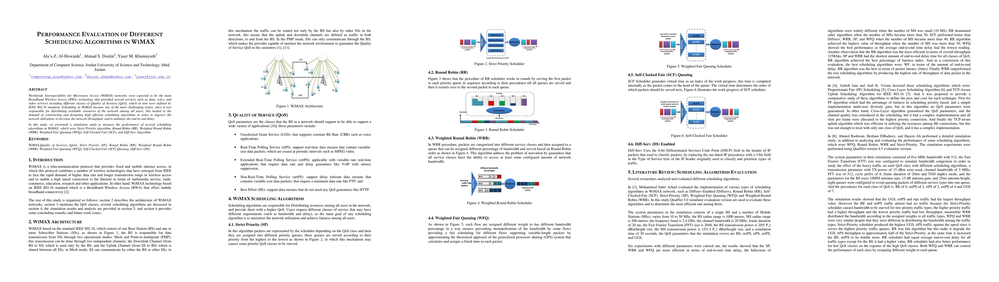 This study evaluates the performance of various scheduling algorithms in WiMAX networks through simulation, focusing on algorithms like Strict Priority, Round-Robin, Weighted Round Robin, Weighted Fair Queuing, Self-Clocked Fair, and Diff-Serv to enhance network utilization, throughput, and reduce delay.