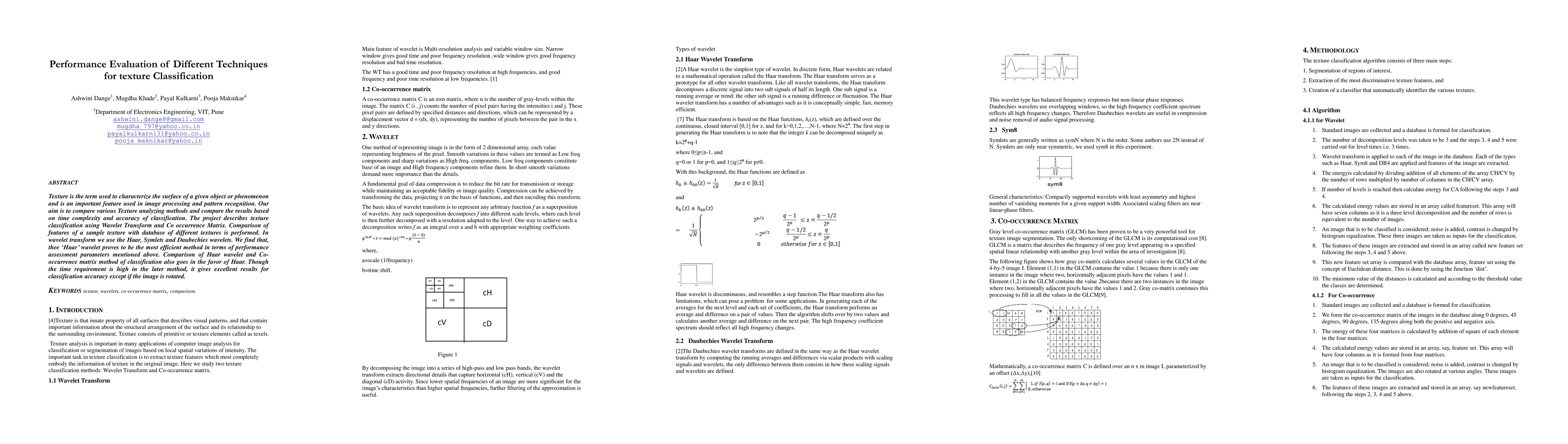 This paper evaluates various texture classification techniques, focusing on wavelet transforms (Haar, Symlets, Daubechies) and co-occurrence matrix methods. The Haar wavelet is found to be the most efficient in terms of time complexity and accuracy, while the co-occurrence matrix method excels in classification accuracy, though it requires more time and is sensitive to image rotation.