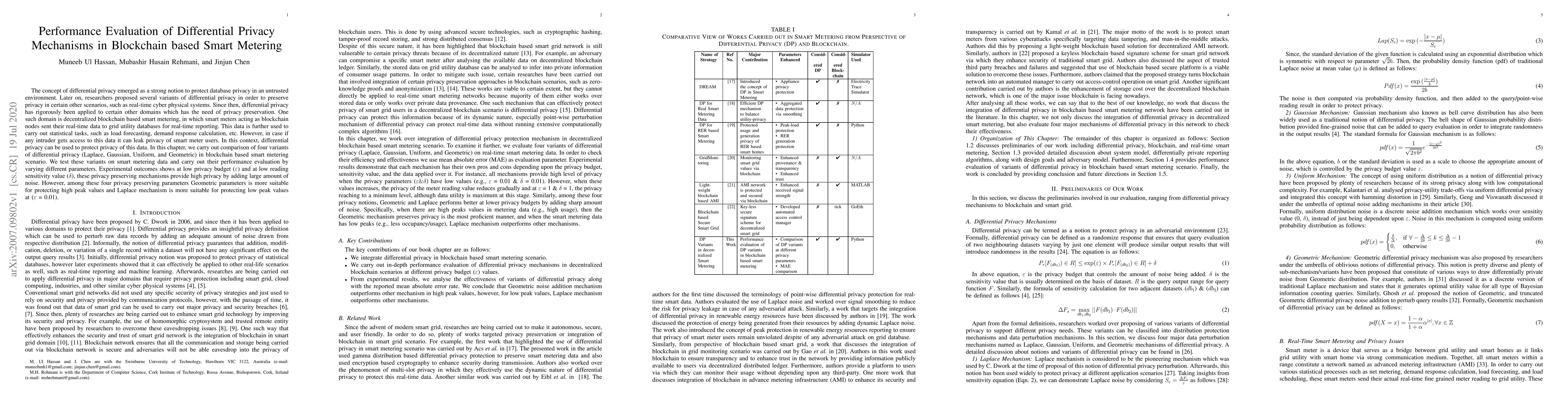 The concept of differential privacy emerged as a strong notion to protect database privacy in an untrusted environment. Later on, researchers proposed several variants of differential privacy in order to preserve privacy in certain other scenarios, such as real-time cyber physical systems. Since then, differential privacy has rigorously been applied to certain other domains which has the need of privacy preservation. One such domain is decentralized blockchain based smart metering, in which smart meters acting as blockchain nodes sent their real-time data to grid utility databases for real-time reporting. This data is further used to carry out statistical tasks, such as load forecasting, demand response calculation, etc. However, in case if any intruder gets access to this data it can leak privacy of smart meter users. In this context, differential privacy can be used to protect privacy of this data. In this chapter, we carry out comparison of four variants of differential privacy (Laplace, Gaussian, Uniform, and Geometric) in blockchain based smart metering scenario. We test these variants on smart metering data and carry out their performance evaluation by varying different parameters. Experimental outcomes shows at low privacy budget ($\varepsilon$) and at low reading sensitivity value ($\delta$), these privacy preserving mechanisms provide high privacy by adding large amount of noise. However, among these four privacy preserving parameters Geometric parameters is more suitable for protecting high peak values and Laplace mechanism is more suitable for protecting low peak values at ($\varepsilon$ = 0.01).