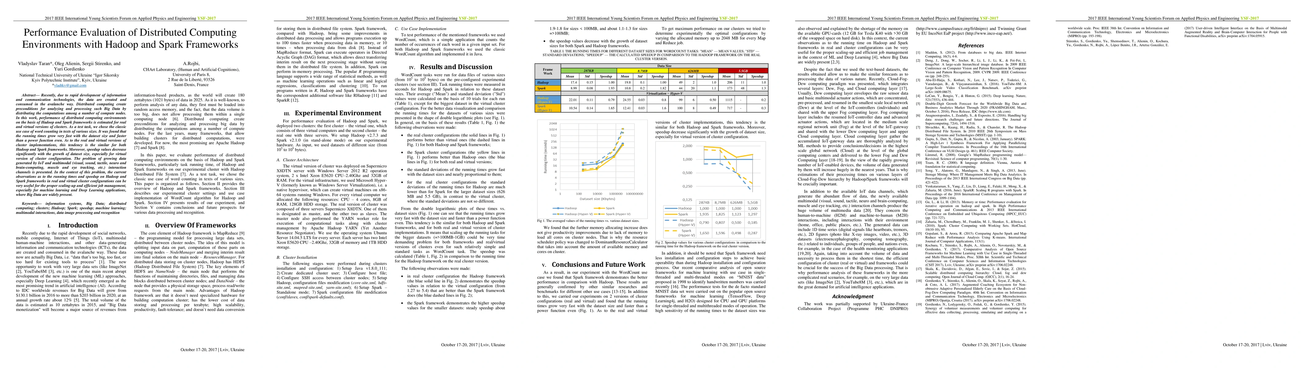 Recently, due to rapid development of information and communication technologies, the data are created and consumed in the avalanche way. Distributed computing create preconditions for analyzing and processing such Big Data by distributing the computations among a number of compute nodes. In this work, performance of distributed computing environments on the basis of Hadoop and Spark frameworks is estimated for real and virtual versions of clusters. As a test task, we chose the classic use case of word counting in texts of various sizes. It was found that the running times grow very fast with the dataset size and faster than a power function even. As to the real and virtual versions of cluster implementations, this tendency is the similar for both Hadoop and Spark frameworks. Moreover, speedup values decrease significantly with the growth of dataset size, especially for virtual version of cluster configuration. The problem of growing data generated by IoT and multimodal (visual, sound, tactile, neuro and brain-computing, muscle and eye tracking, etc.) interaction channels is presented. In the context of this problem, the current observations as to the running times and speedup on Hadoop and Spark frameworks in real and virtual cluster configurations can be very useful for the proper scaling-up and efficient job management, especially for machine learning and Deep Learning applications, where Big Data are widely present.