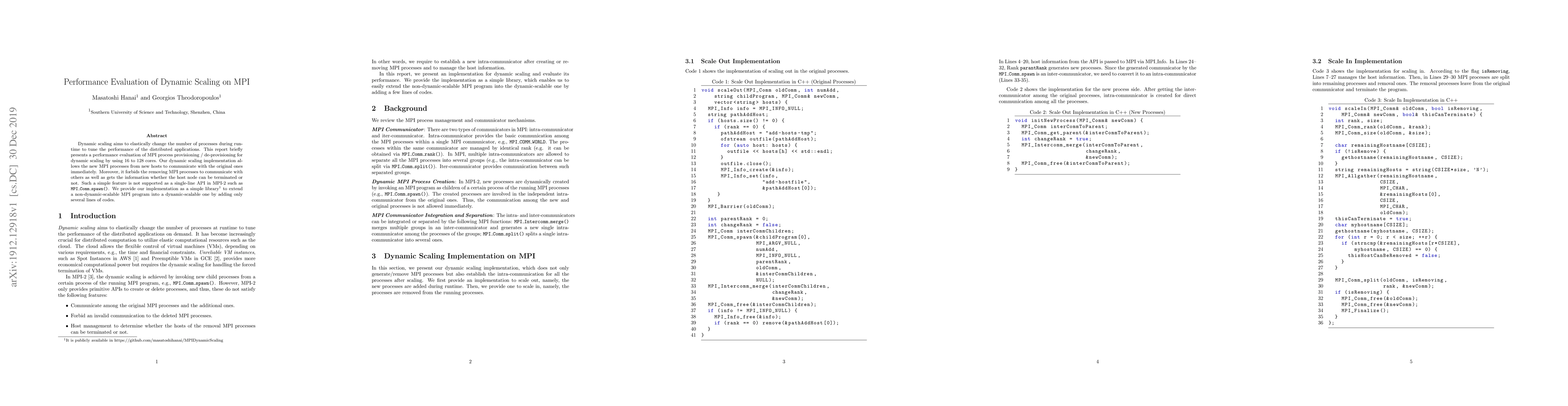 This paper evaluates the performance of dynamic scaling in MPI applications, focusing on the ability to elastically adjust the number of processes during runtime. The study implements a library that allows new MPI processes to communicate immediately with existing ones, while also determining if host nodes can be terminated, thus extending non-dynamic-scalable MPI programs with minimal code changes.