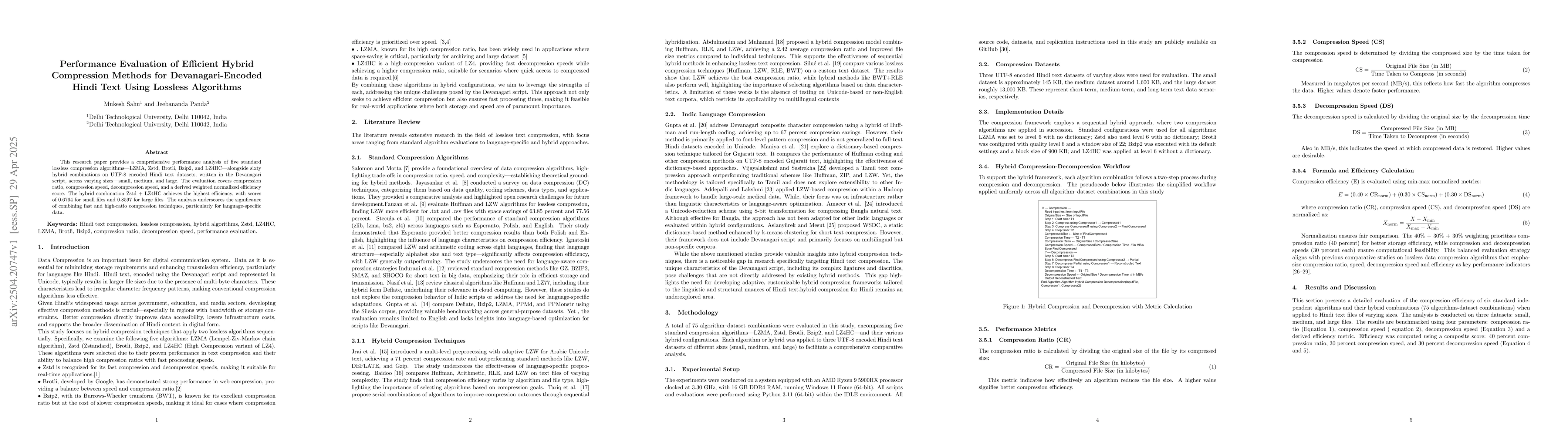 The paper presents a comparative analysis of lossless compression algorithms and their hybrids for Devanagari-encoded Hindi text, providing insights into optimal methods for language-specific data compression.