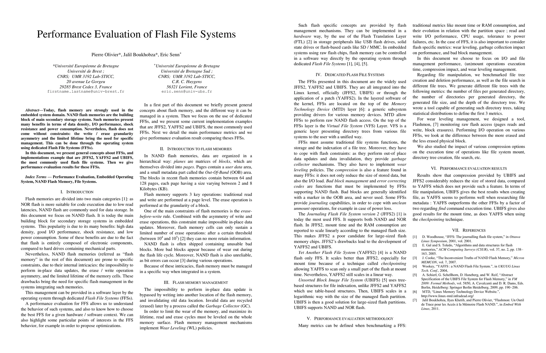 Today, flash memory are strongly used in the embedded system domain. NAND flash memories are the building block of main secondary storage systems. Such memories present many benefits in terms of data density, I/O performance, shock resistance and power consumption. Nevertheless, flash does not come without constraints: the write / erase granularity asymmetry and the limited lifetime bring the need for specific management. This can be done through the operating system using dedicated Flash File Systems (FFSs). In this document, we present general concepts about FFSs, and implementations example that are JFFS2, YAFFS2 and UBIFS, the most commonly used flash file systems. Then we give performance evaluation results for these FFSs.