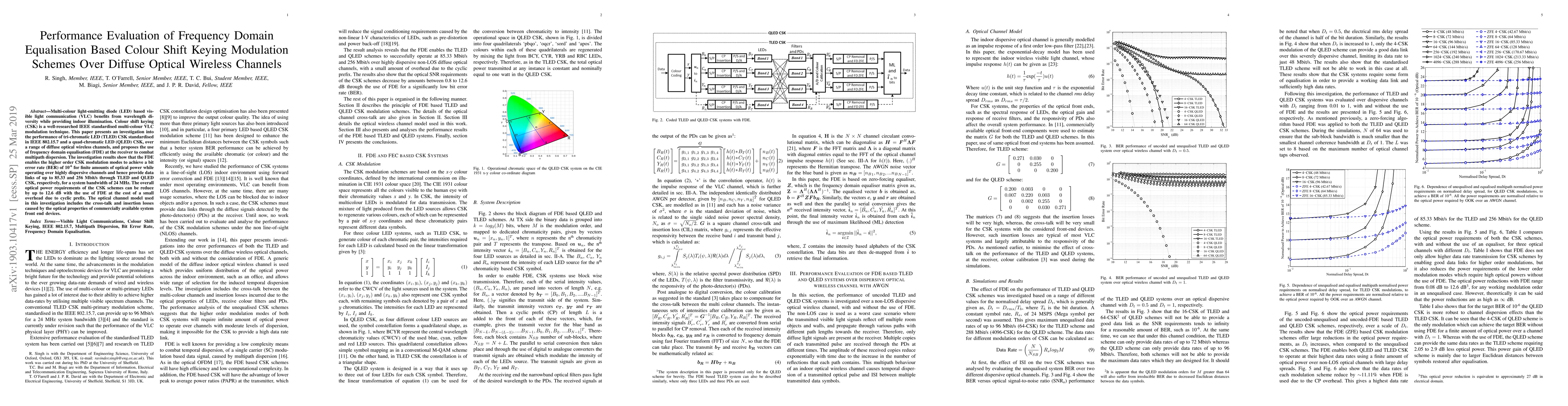 Multi-colour light-emitting diode (LED) based visible light communication (VLC) benefits from wavelength diversity while providing indoor illumination. Colour shift keying (CSK) is a well-researched IEEE standardised multi-colour VLC modulation technique. This paper presents an investigation into the performance of tri-chromatic LED (TLED) CSK standardised in IEEE 802.15.7 and a quad-chromatic LED (QLED) CSK, over a range of diffuse optical wireless channels, and proposes the use of frequency domain equalisation (FDE) at the receiver to combat multipath dispersion. The investigation results show that the FDE enables the higher order CSK modulation modes to achieve a bit error rate (BER) of 10\textsuperscript{-6} for finite amounts of optical power while operating over highly dispersive channels and hence provide data links of up to 85.33 and 256 Mbit/s through TLED and QLED CSK, respectively, for a system bandwidth of 24 MHz. The overall optical power requirements of the CSK schemes can be reduce by up to 12.6 dB with the use of FDE at the cost of a small overhead due to cyclic prefix. The optical channel model used in this investigation includes the cross-talk and insertion losses caused by the optical properties of commercially available system front end devices.
