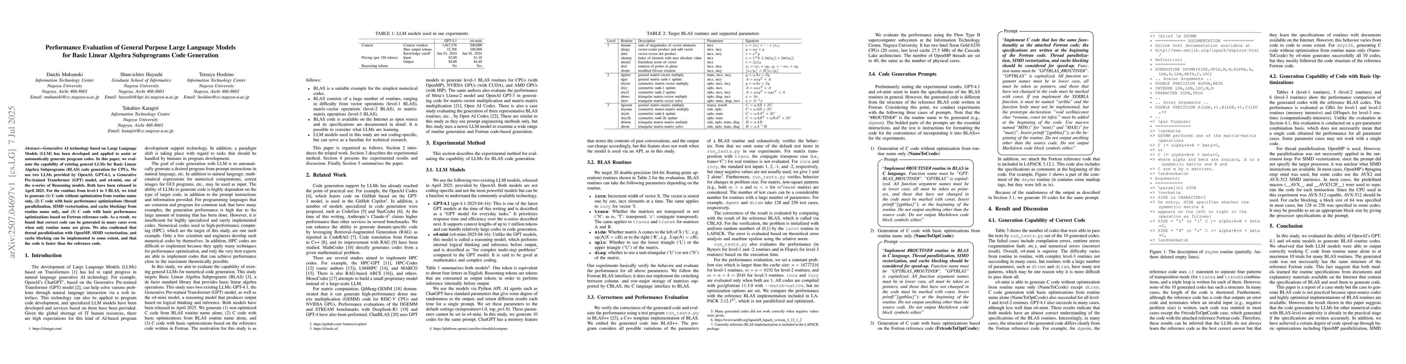 Generative AI technology based on Large Language Models (LLM) has been developed and applied to assist or automatically generate program codes. In this paper, we evaluate the capability of existing general LLMs for Basic Linear Algebra Subprograms (BLAS) code generation for CPUs. We use two LLMs provided by OpenAI: GPT-4.1, a Generative Pre-trained Transformer (GPT) model, and o4-mini, one of the o-series of Reasoning models. Both have been released in April 2025. For the routines from level-1 to 3 BLAS, we tried to generate (1) C code without optimization from routine name only, (2) C code with basic performance optimizations (thread parallelization, SIMD vectorization, and cache blocking) from routine name only, and (3) C code with basic performance optimizations based on Fortran reference code. As a result, we found that correct code can be generated in many cases even when only routine name are given. We also confirmed that thread parallelization with OpenMP, SIMD vectorization, and cache blocking can be implemented to some extent, and that the code is faster than the reference code.