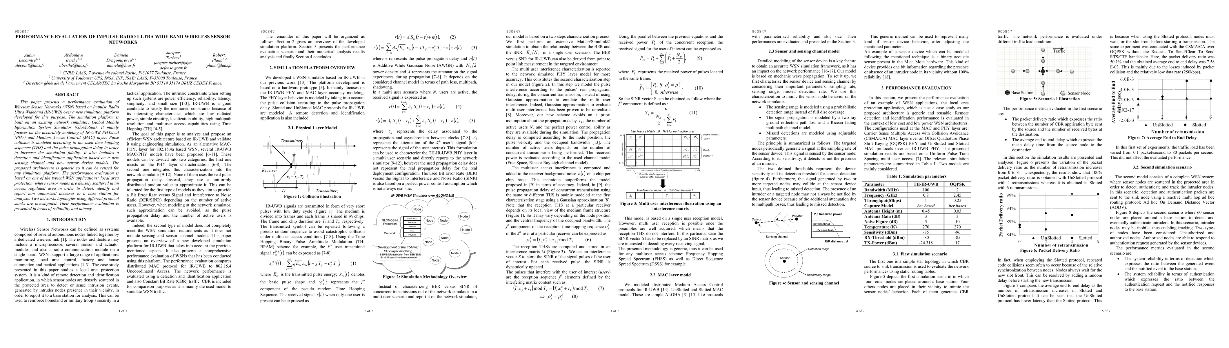 This paper presents a performance evaluation of Wireless Sensor Networks (WSN) based on Impulse Radio Ultra Wideband (IR-UWB) over a new simulation platform developed for this purpose. The simulation platform is built on an existing network simulator: Global Mobile Information System Simulator (GloMoSim). It mainly focuses on the accurately modeling of IR-UWB PHYsical (PHY) and Medium Access Control (MAC) layer. Pulse collision is modeled according to the used time hopping sequence (THS) and the pulse propagation delay in order to increase the simulation fidelity. It also includes a detection and identification application based on a new sensing channel and new sensor device models. The proposed architecture is generic so it can be reused for any simulation platform. The performance evaluation is based on one of the typical WSN applications: local area protection, where sensor nodes are densely scattered in an access regulated area in order to detect, identify and report non authorized accesses to a base station for analysis. Two networks topologies using different protocol stacks are investigated. Their performance evaluation is presented in terms of reliability and latency.