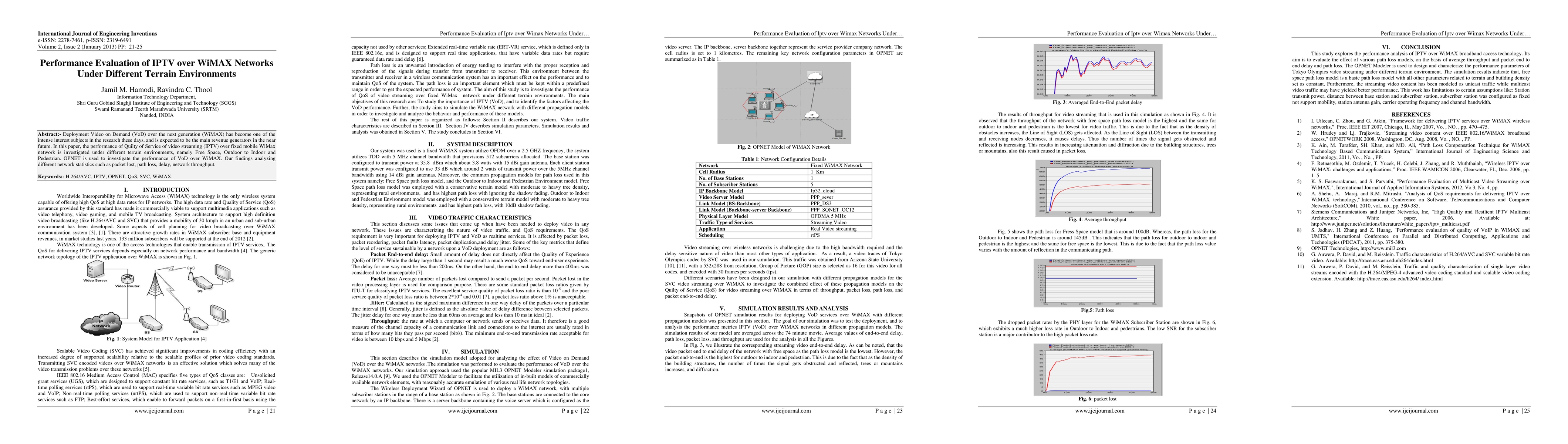 This paper evaluates the performance of IPTV over WiMAX networks under various terrain environments using OPNET simulations. Key metrics such as packet loss, path loss, delay, and network throughput are analyzed to assess the Quality of Service (QoS) for Video on Demand (VoD) services.