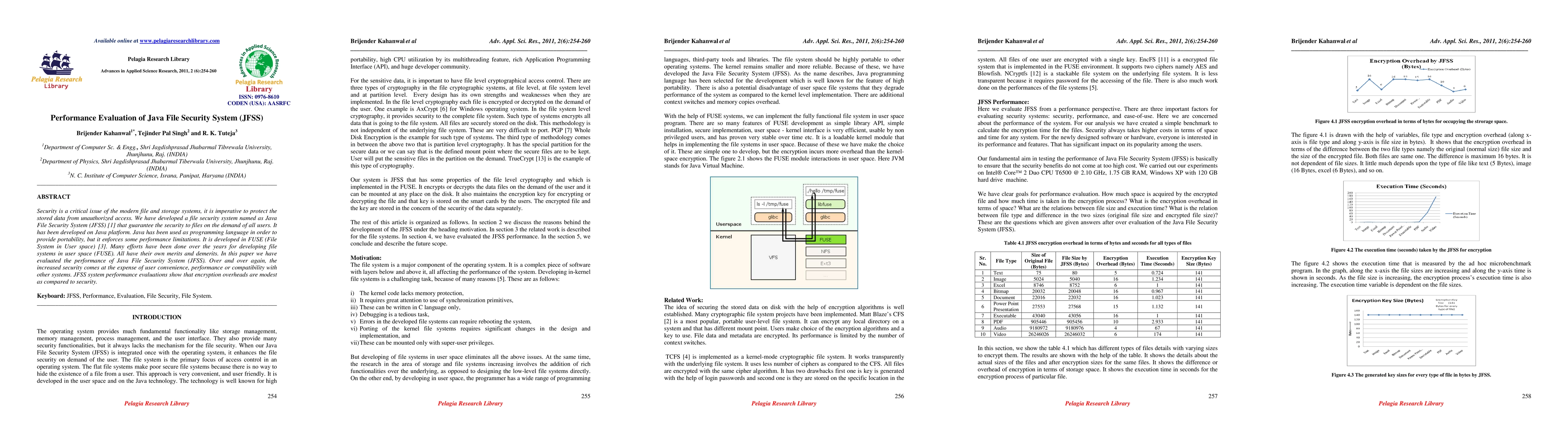 This paper evaluates the performance of the Java File Security System (JFSS), developed to secure files on the Java platform using FUSE. Despite Java's performance limitations, the study finds that JFSS's encryption overheads are modest relative to its security benefits.
