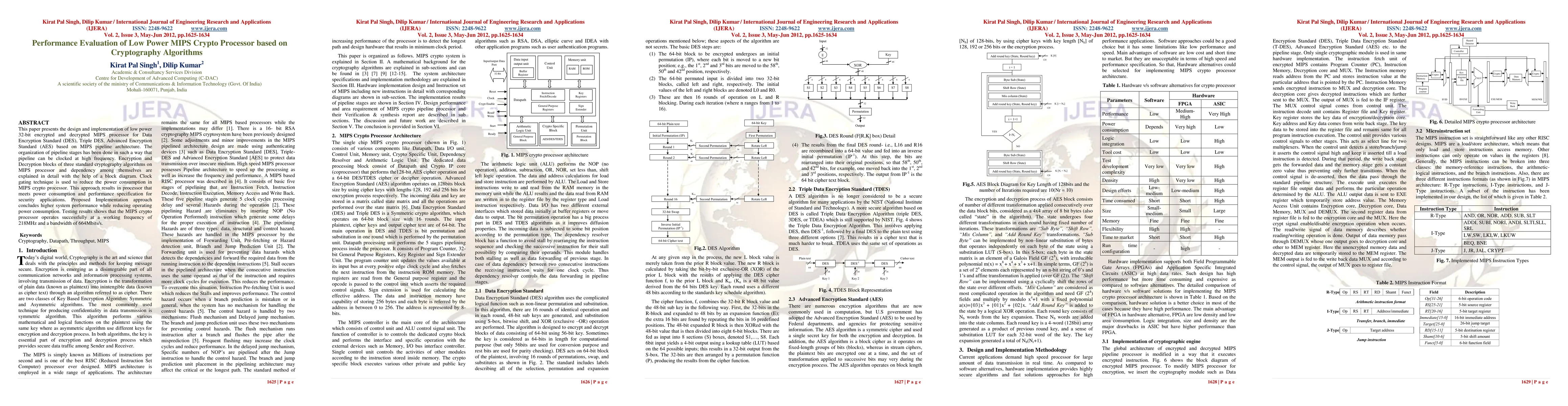 This paper designs a low power 32-bit MIPS crypto processor implementing DES, Triple DES, and AES algorithms, utilizing pipeline architecture and clock gating to reduce power consumption. Testing confirms successful operation at 218MHz with a bandwidth of 664Mbits/s.