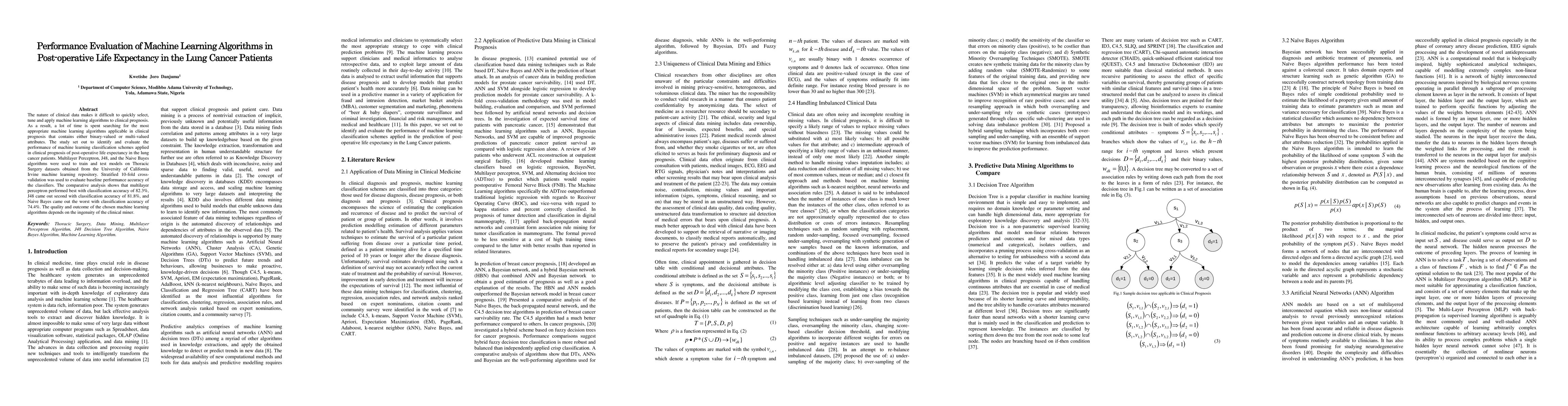 A study evaluated three machine learning algorithms (Multilayer Perceptron, J48, and Naive Bayes) for predicting post-operative life expectancy in lung cancer patients, finding that Multilayer Perceptron performed best with an accuracy of 82.3%.