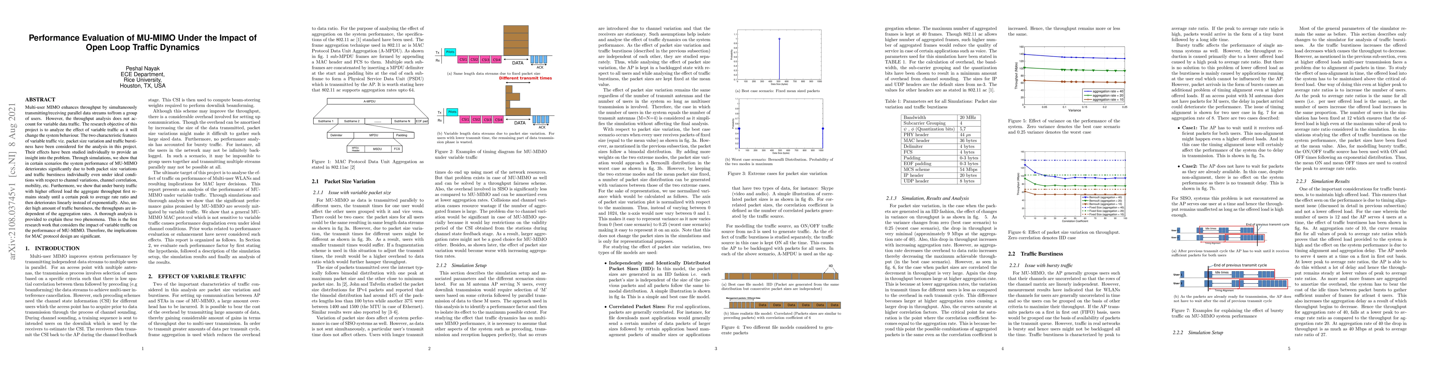 Multi-user MIMO enhances throughput by simultaneously transmitting/receiving parallel data streams to/from a group of users. However, the throughput analysis does not ac-count for variable data traffic. The research objective of this project is to analyze the effect of variable traffic as it will change the system behavior. The two characteristic features of variable traffic viz. packet size variation and traffic burstiness have been considered for the analysis in this project. Their effects have been studied individually to provide an insight into the problem. Through simulations, we show that in certain scenarios the system performance of MU-MIMO deteriorates significantly due to both packet size variations and traffic burstiness individually even under ideal conditions with respect to channel variations, channel correlation, mobility, etc. Furthermore, we show that under bursty traffic with higher offered load the aggregate throughput first re-mains steady until a certain peak to average rate ratio and then deteriorates linearly instead of exponentially. Also, un-der high amount of traffic burstiness, the throughputs are in-dependent of the aggregation rates. A thorough analysis is provided to explain these two phenomena. This is the first research work that considers the impact of variable traffic on the performance of MU-MIMO. Therefore, the implications for MAC protocol design are significant.