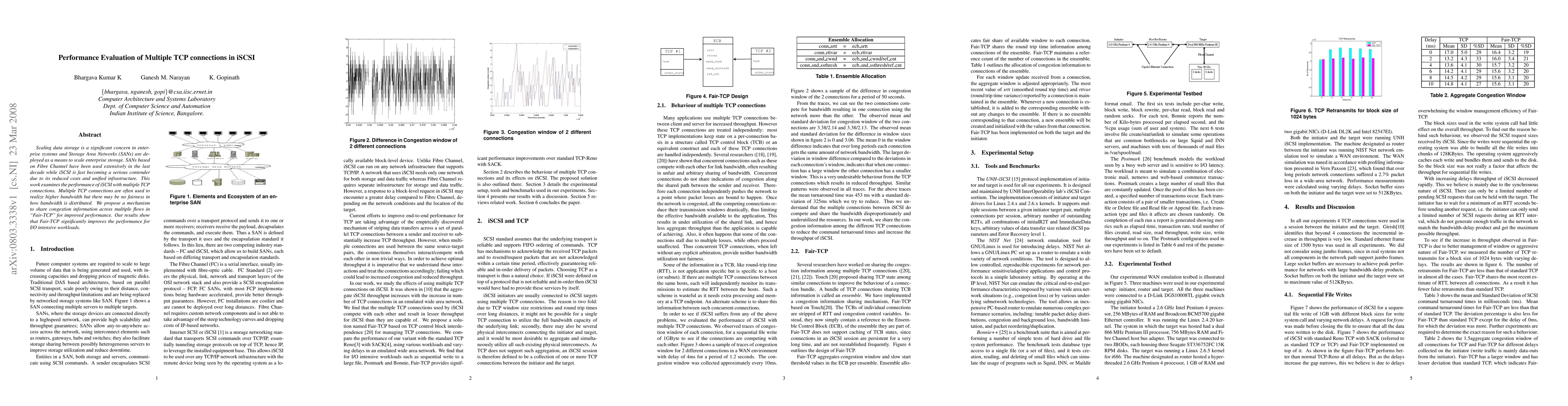 This paper evaluates the performance of iSCSI using multiple TCP connections to achieve higher bandwidth, proposing a Fair-TCP mechanism to share congestion information for improved performance. Results indicate that Fair-TCP significantly enhances performance for I/O intensive workloads.