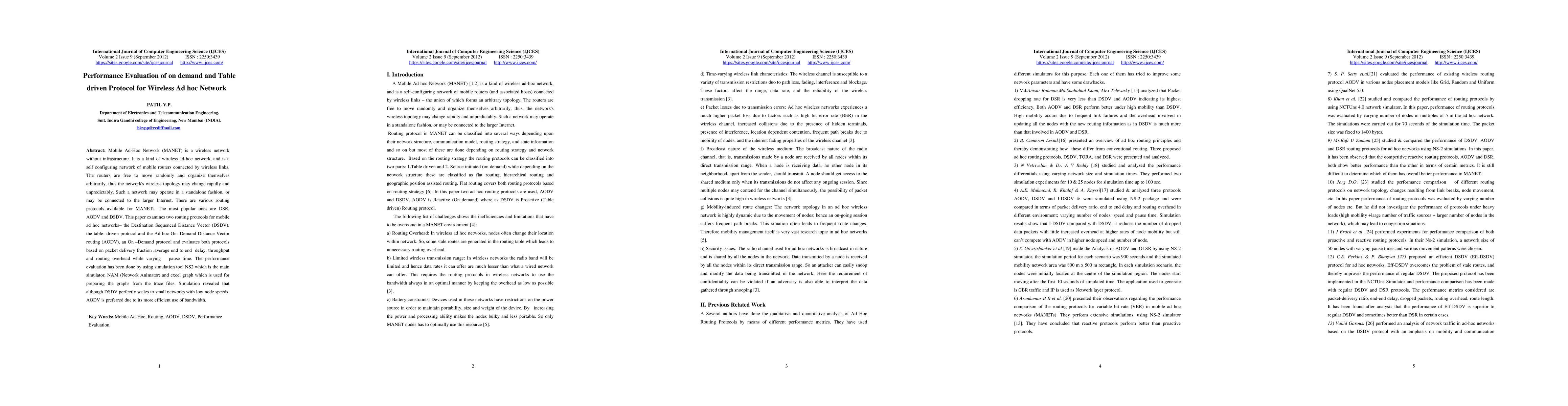 This paper evaluates the performance of the Destination Sequenced Distance Vector (table driven) and Ad hoc On Demand Distance Vector (on-demand) routing protocols for mobile ad hoc networks using NS2 simulation. The results show that while DSDV scales well for small networks, AODV is more efficient in terms of bandwidth usage.