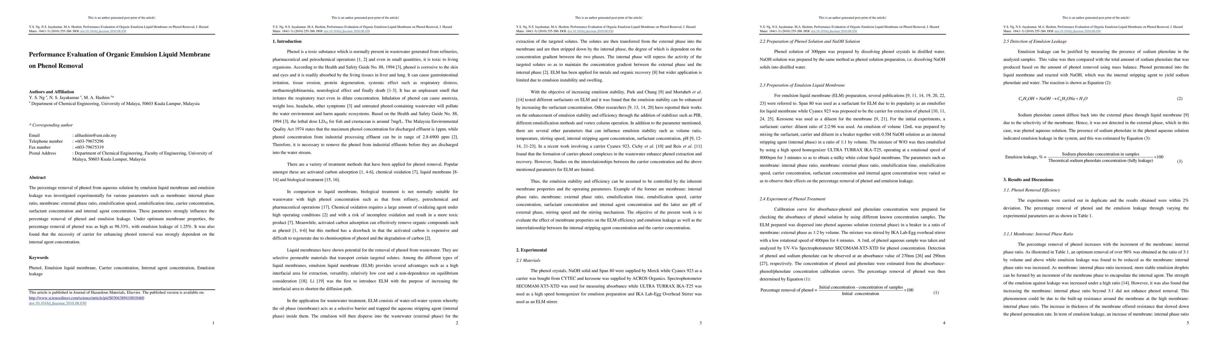 The percentage removal of phenol from aqueous solution by emulsion liquid membrane and emulsion leakage was investigated experimentally for various parameters such as membrane:internal phase ratio, membrane:external phase ratio, emulsification speed, emulsification time, carrier concentration, surfactant concentration and internal agent concentration. These parameters strongly influence the percentage removal of phenol and emulsion leakage. Under optimum membrane properties, the percentage removal of phenol was as high as 98.33%, with emulsion leakage of 1.25%. It was also found that the necessity of carrier for enhancing phenol removal was strongly dependent on the internal agent concentration.